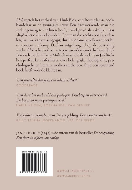 Jan Brokken schreef met Blok het levensverhaal van een boekverkoper, de Rotterdammer Huib Blok, die met beide benen in de twintigste eeuw stond. Een man die tijdens zijn gevangenschap in een concentratiekamp kracht putte uit een tekening van zijn nieuwe winkelpui, een pui die er daadwerkelijk zou komen, en een man die na de oorlog onverwachte steun vond bij concullega s en naaste relaties.