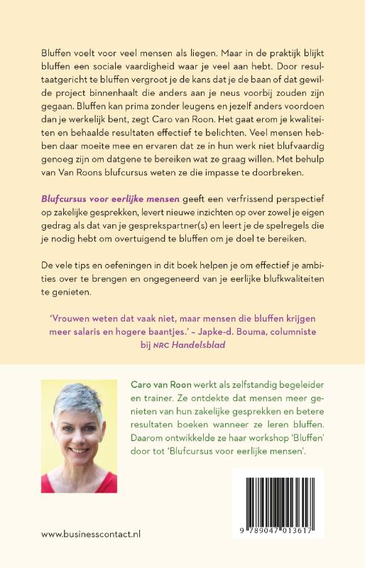 In ‘Blufcursus voor eerlijke mensen’ rekent Caro van Roon af met het beeld dat je moet liegen om te bluffen. In de praktijk blijkt bluffen namelijk een sociale vaardigheid te zijn waar je veel aan hebt. Door resultaatgericht te bluffen vergroot je de kans dat je de baan of dat gewilde project binnenhaalt die anders aan je neus voorbij zouden zijn gegaan. Bluffen kan prima zonder leugens en jezelf anders voordoen dan je werkelijk bent, zegt Caro van Roon. Het gaat erom je kwaliteiten en behaalde resultaten effectief te belichten. Veel mensen hebben daar moeite mee en ervaren dat ze in hun werk niet blufvaardig genoeg zijn om datgene te bereiken wat ze graag willen. Met behulp van Van Roons blufcursus weten ze die impasse te doorbreken.