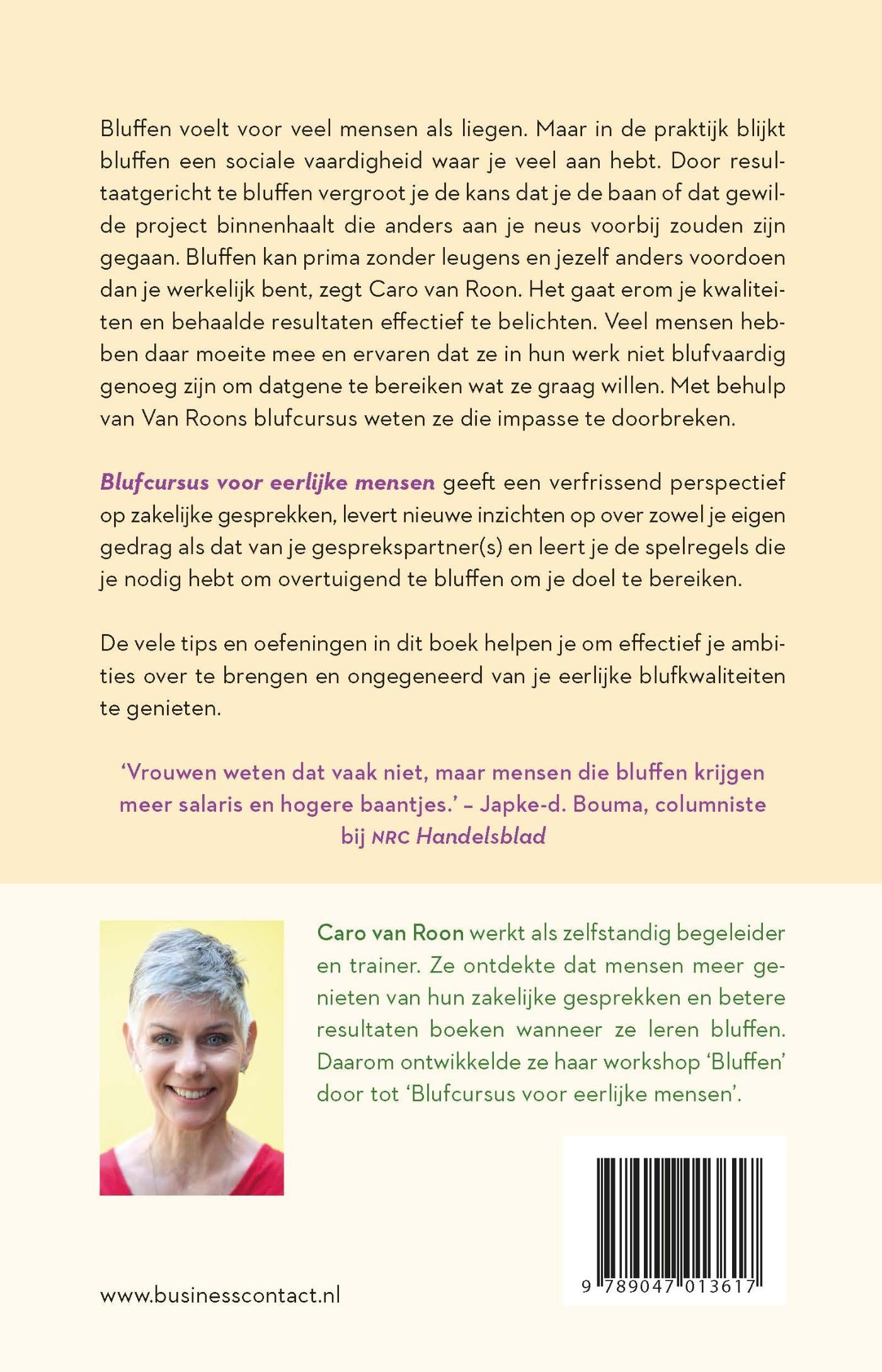 In ‘Blufcursus voor eerlijke mensen’ rekent Caro van Roon af met het beeld dat je moet liegen om te bluffen. In de praktijk blijkt bluffen namelijk een sociale vaardigheid te zijn waar je veel aan hebt. Door resultaatgericht te bluffen vergroot je de kans dat je de baan of dat gewilde project binnenhaalt die anders aan je neus voorbij zouden zijn gegaan. Bluffen kan prima zonder leugens en jezelf anders voordoen dan je werkelijk bent, zegt Caro van Roon. Het gaat erom je kwaliteiten en behaalde resultaten effectief te belichten. Veel mensen hebben daar moeite mee en ervaren dat ze in hun werk niet blufvaardig genoeg zijn om datgene te bereiken wat ze graag willen. Met behulp van Van Roons blufcursus weten ze die impasse te doorbreken.