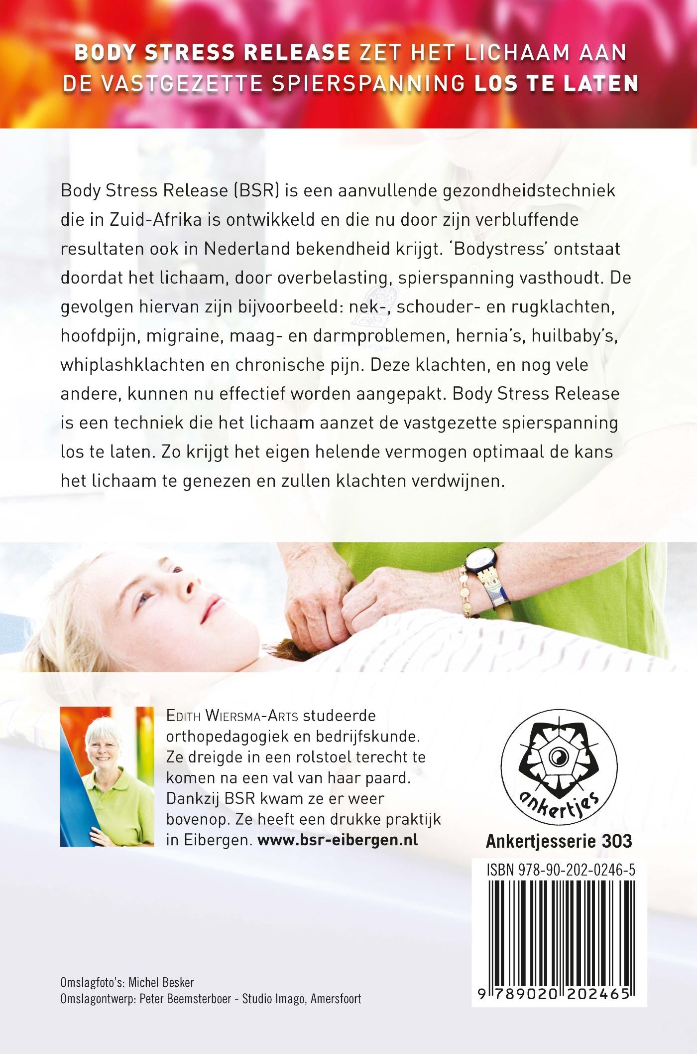 Body Stress Release (BSR) is een aanvullende gezondheidstechniek die in Zuid-Afrika is ontwikkeld en die nu door zijn verbluffende resultaten ook in Nederland bekendheid krijgt. 'Bodystress' ontstaat doordat het lichaam, door overbelasting, spierspanning vasthoudt. De gevolgen hiervan zijn bijvoorbeeld: nek-, schouder- en rugklachten, hoofdpijn, migraine, maag- en darmproblemen, hernia's, huilbaby's, whiplashklachten en chronische pijn. Body Stress Release is een techniek die het lichaam aanzet de vastgezette spierspanning los te laten. Zo krijgt het eigen helende vermogen optimaal de kans het lichaam te genezen en zullen klachten verdwijnen. Body Stress Release zet het lichaam aan de vastgezette spierspanning los te laten. Edith Wiersma-Arts studeerde orthopedagogiek en bedrijfskunde. Ze dreigde in een rolstoel terecht te komen na een val van haar paard. Dankzij BSR kwam ze er weer bovenop. Ze heeft een drukke praktijk in Eibergen.