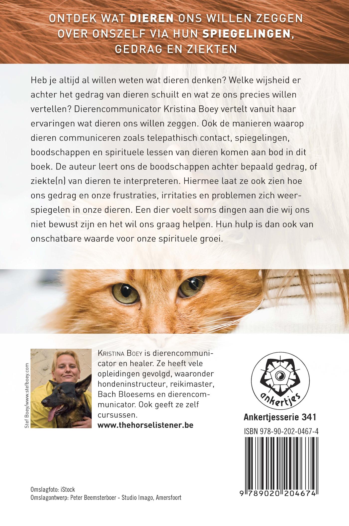 Heb je altijd al willen weten wat dieren denken? Welke wijsheid er achter het gedrag van dieren schuilt en wat ze ons precies willen vertellen? Dierencommunicator Kristina Boey vertelt vanuit haar ervaringen wat dieren ons willen zeggen. Ook de manieren waarop dieren communiceren zoals telepathisch contact, spiegelingen, boodschappen en spirituele lessen van dieren komen in dit boek aan bod. De auteur leert ons de boodschappen achter bepaald gedrag, of ziekte(n) van dieren te interpreteren. Hiermee laat ze ook zien hoe ons gedrag en onze frustraties, irritaties en problemen zich weerspiegelen in onze dieren. Een dier voelt soms dingen aan die wij ons niet bewust zijn en het wil ons graag helpen. Hun hulp is dan ook van onschatbare waarde voor onze spirituele groei.