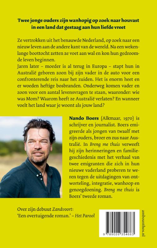 Breng me thuis van Nando Boers gaat over twee jonge ouders die wanhopig zoeken naar houvast in een land dat gestaag aan hun liefde vreet. Ze vertrokken uit het benauwde Nederland, op zoek naar een nieuw leven aan de andere kant van de wereld. Na een wekenlange boottocht zetten ze voet aan wal en kon hun gedroomde leven beginnen.