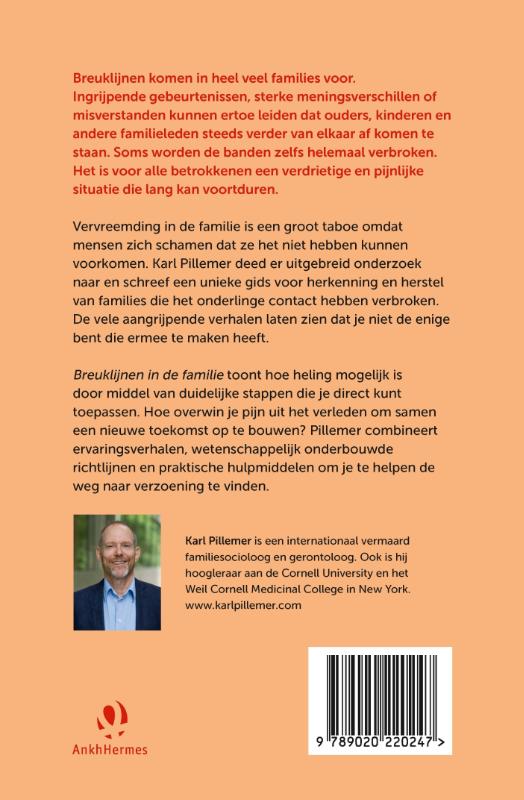 Met Breuklijnen in de familie geeft Karl Pillemer je handvatten en tips om de weg naar verzoening te vinden. Breuklijnen komen in heel veel families voor. Ingrijpende gebeurtenissen, sterke meningsverschillen of misverstanden kunnen ertoe leiden dat ouders, kinderen en andere familieleden steeds verder van elkaar af komen te staan. Soms worden de banden helemaal verbroken. Het is voor alle betrokkenen een verdrietige en pijnlijke situaite die lang kan voortduren.