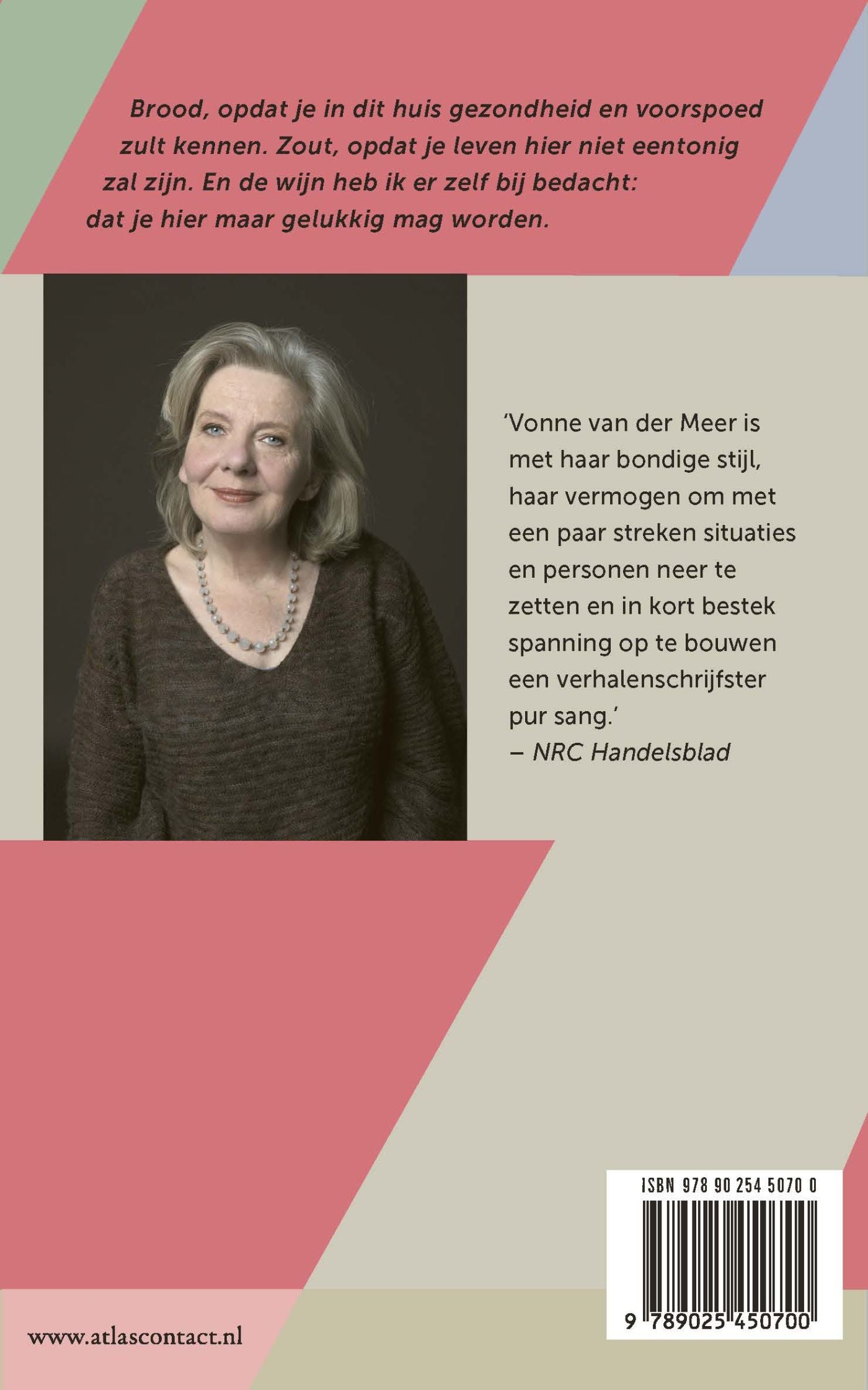 Wennen aan een nieuw huis en het afscheid van het oude leven zijn de rode draad in de verhalen in ‘Brood, zout, wijn’ van Vonne van der Meer. Geen verandering haalt zoveel overhoop als een verhuizing. Een vrouw heeft zoveel moeite met het vertrek uit haar geliefde huis dat ze er op een nacht terugkeert en inbreekt. Een weduwe begraaft een Jozefbeeld in de tuin – baat het niet dan schaadt het niet – om de verkoop van haar huis te bespoedigen. Een makelaar vindt de jonge vrouw van het stel aan wie hij een appartement probeert te verkopen veel te aardig voor de praatjesmaker naast haar. Moet hij ingrijpen of niet?