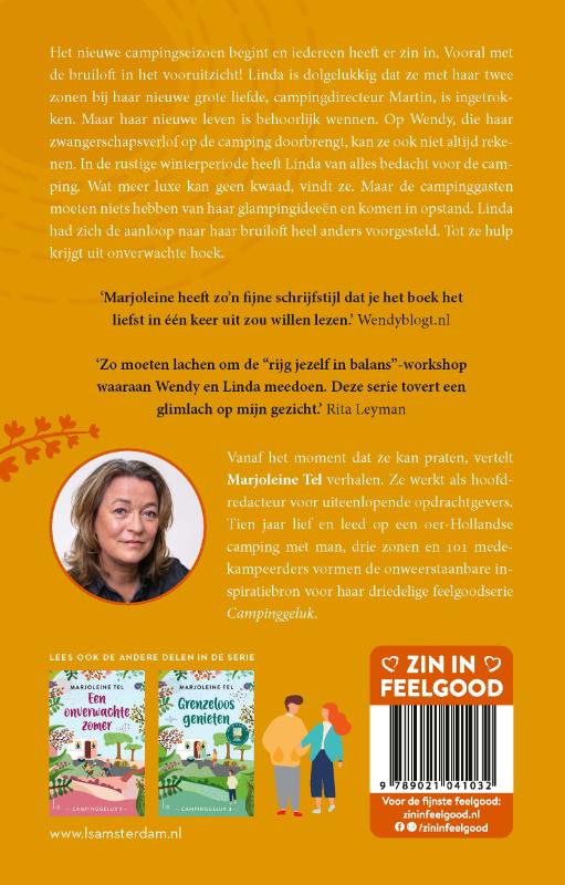In Bruiloft op slippers, het tweede deel van de bestsellerserie Campinggeluk, begint eindelijk het nieuwe campingseizoen en iedereen hee¬ft er zin in. Vooral met de bruiloft¬ in het vooruitzicht! Linda is dolgelukkig dat ze met haar twee zonen bij haar nieuwe grote liefde, campingdirecteur Martin, is ingetrokken. Maar haar nieuwe leven is behoorlijk wennen. Op Wendy, die haar zwangerschapsverlof op de camping doorbrengt, kan ze ook niet altijd rekenen. In de rustige winterperiode heeft¬ Linda van alles bedacht voor de camping. Wat meer luxe kan geen kwaad, vindt ze. Maar de campinggasten moeten niets hebben van haar glampingideeën en komen in opstand. Linda had zich de aanloop naar haar bruiloft¬ heel anders voorgesteld. Tot ze hulp krijgt uit onverwachte hoek.