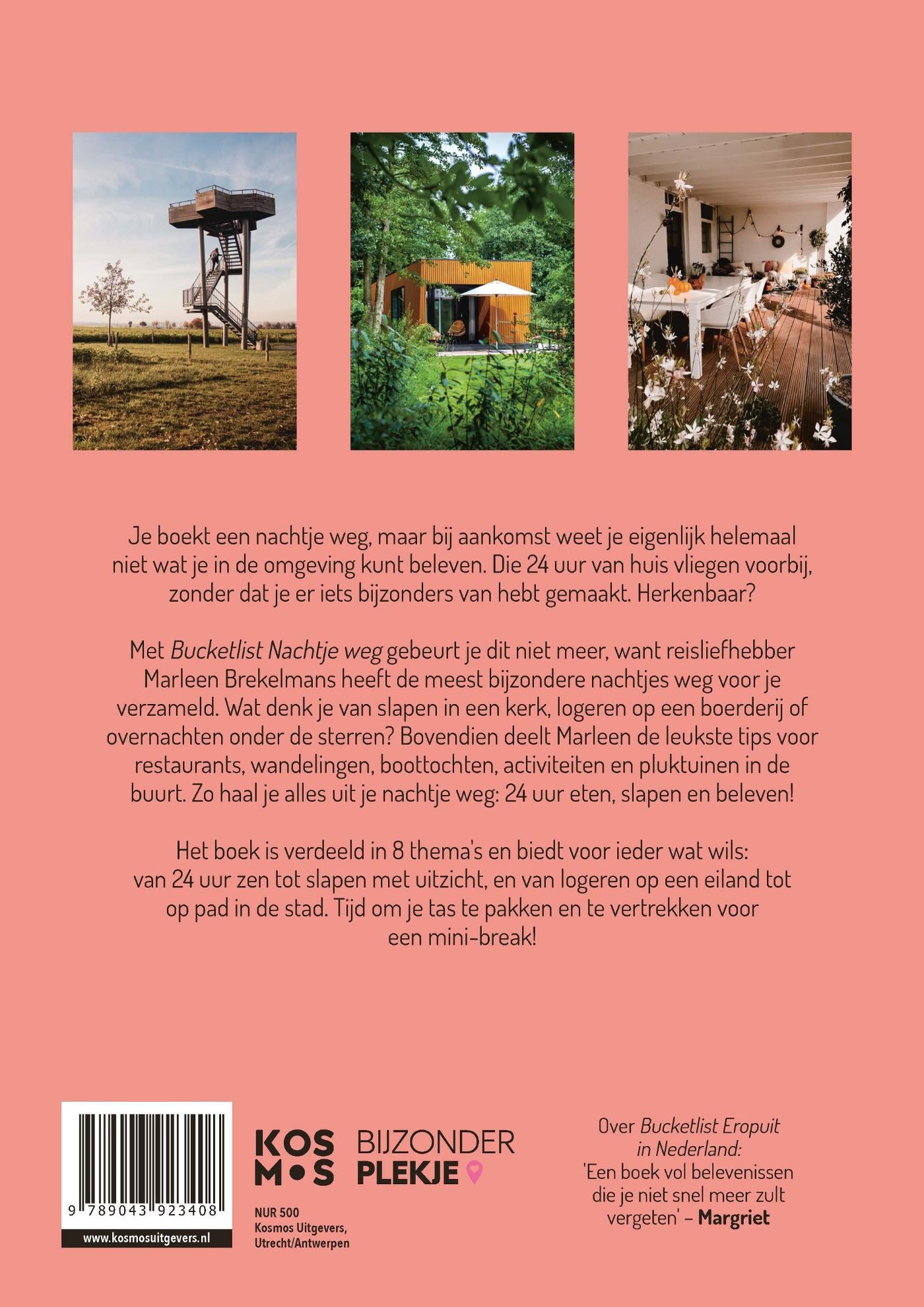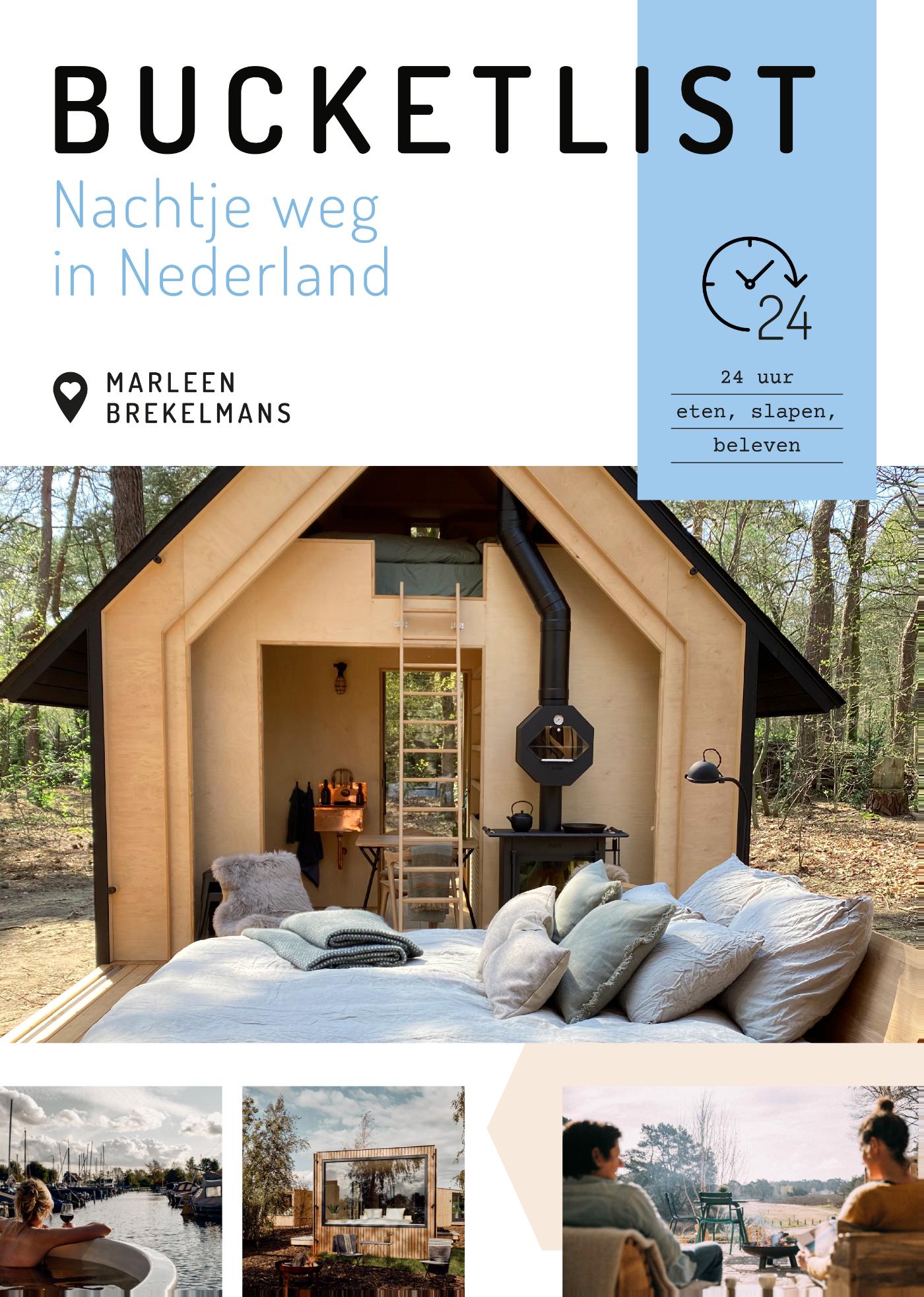 Marleen Brekelmans, vrijetijdsexpert en eigenaar van bijzonderplekje.nl, laat je in Bucketlist Nachtje weg in Nederland zien waar je moet zijn voor een unieke overnachting. In deze nieuwe gids geeft ze alles tips die je nodig hebt voor een compleet nachtje weg: waar te slapen, waar te eten en wat te doen. Het boek is verdeeld in verschillende hoofdstukken en laat je zien hoe je 24 uur doorbrengt in bijvoorbeeld een stad, op een eiland, in luxe of met een bijzonder uitzicht. Of je nou zin hebt in even zalig zen, back to nature of juist de bruisende energie van een stad: in één oogopslag weet je waar je moet zijn, en ben je er 24 uur even helemaal uit.
