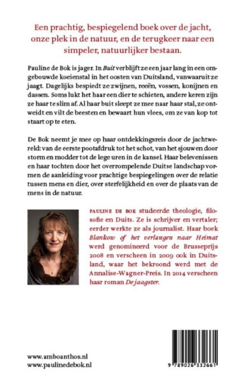 Pauline de Bok is jager. In Buit verblijft ze een jaar lang in een omgebouwde koeienstal in het oosten van Duitsland, van waaruit ze jaagt. Dagelijks bespiedt ze vanuit haar kansel zwijnen, reeën, vossen, konijnen en dassen. Soms lukt het haar een dier te schieten, andere keren zijn ze haar te slim af. Al haar buit sleept ze mee naar haar stal, ze ontweit en vilt de beesten en bewaart hun vlees, om het van kop tot staart op te eten.