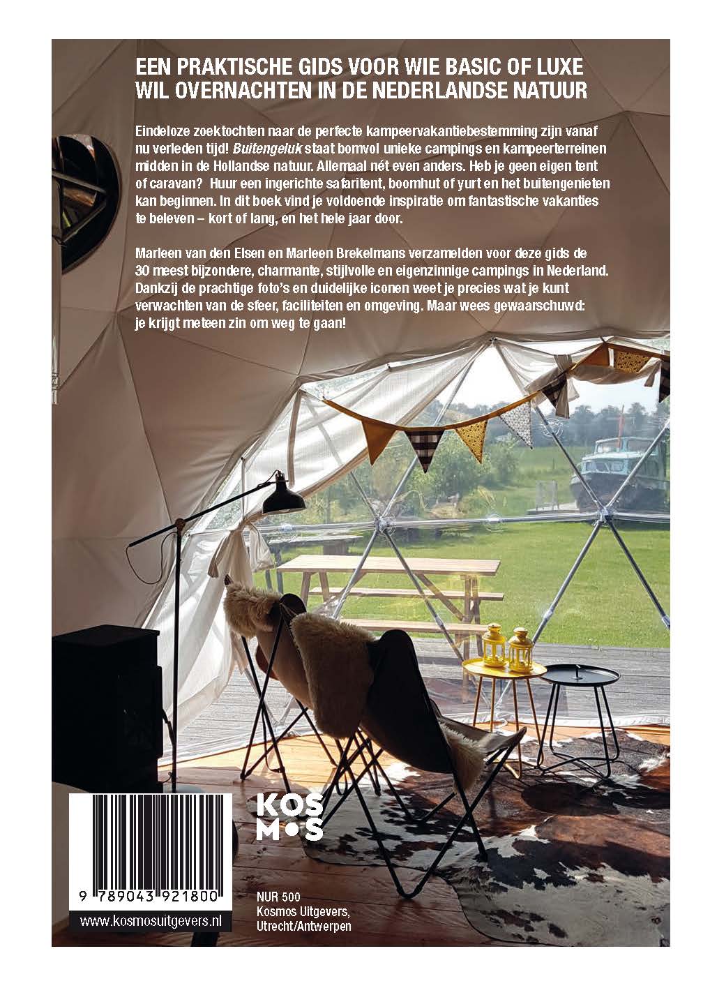 Buitengeluk is een praktische gids over kamperen in Nederland, samengesteld door Marleen van den Elsen en Marleen Brekelmans. In prachtige foto’s laten zij de 30 mooiste natuurcampings, charmecampings, kleine campings en idyllische campings van Nederland zien. Allemaal nét even anders. Heb je geen eigen tent of caravan? Huur een ingerichte safaritent, stoere boomhut of stijlvolle yurt en het buitengenieten kan beginnen. Eindeloze zoektochten naar de perfecte kampeervakantiebestemming behoren tot het verleden met de ideale campinggids voor Nederland.