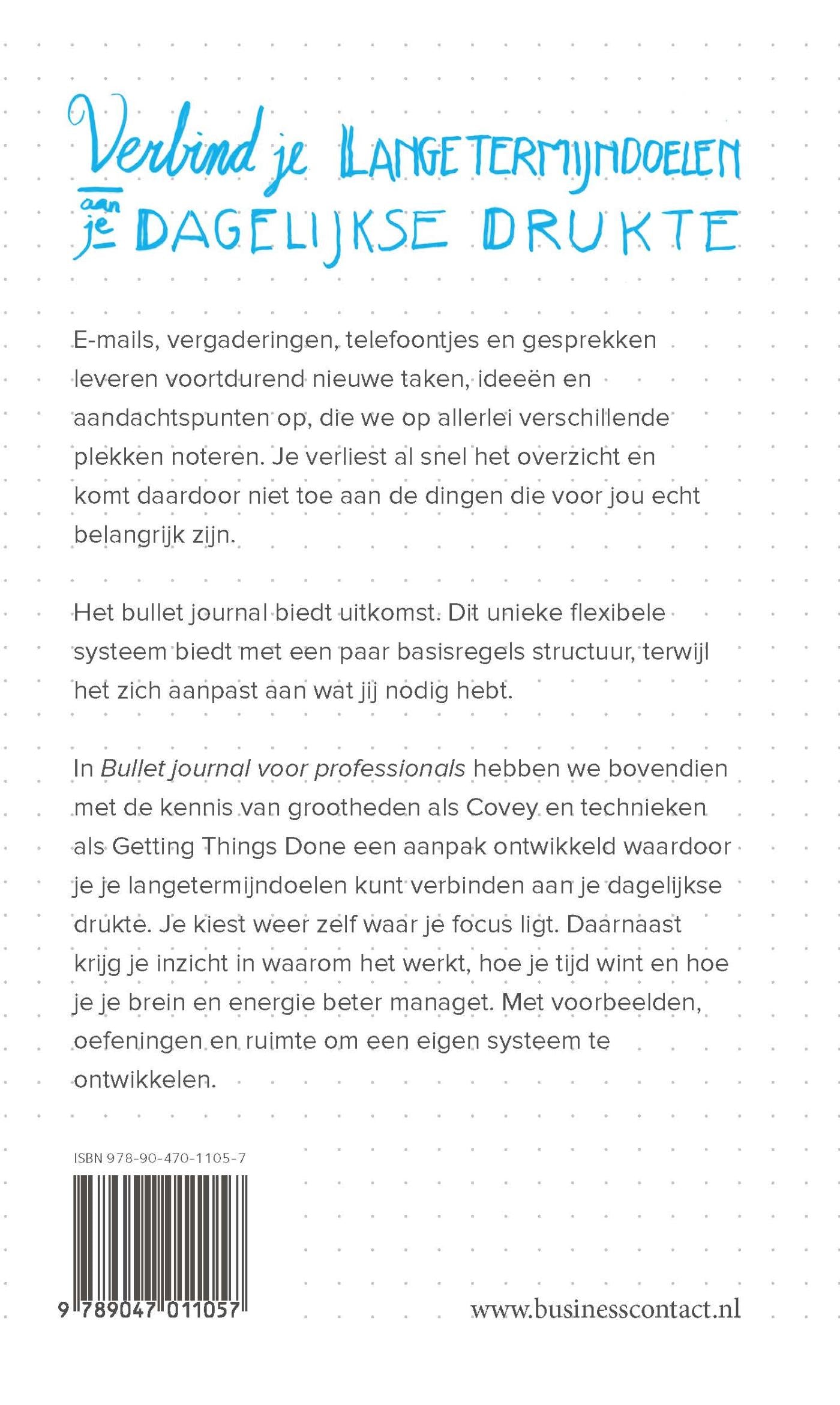 In ‘Bullet journal voor professionals’ hebben we bovendien met de kennis van grootheden als Covey en technieken als Getting Things Done een aanpak ontwikkeld waardoor je je langetermijndoelen kunt verbinden aan je dagelijkse drukte. Je kiest weer zelf waar je focus ligt. Daarnaast krijg je inzicht in waarom het werkt, hoe je tijd wint en hoe je je brein en energie beter managet. Met voorbeelden, oefeningen en ruimte om een eigen systeem te ontwikkelen.