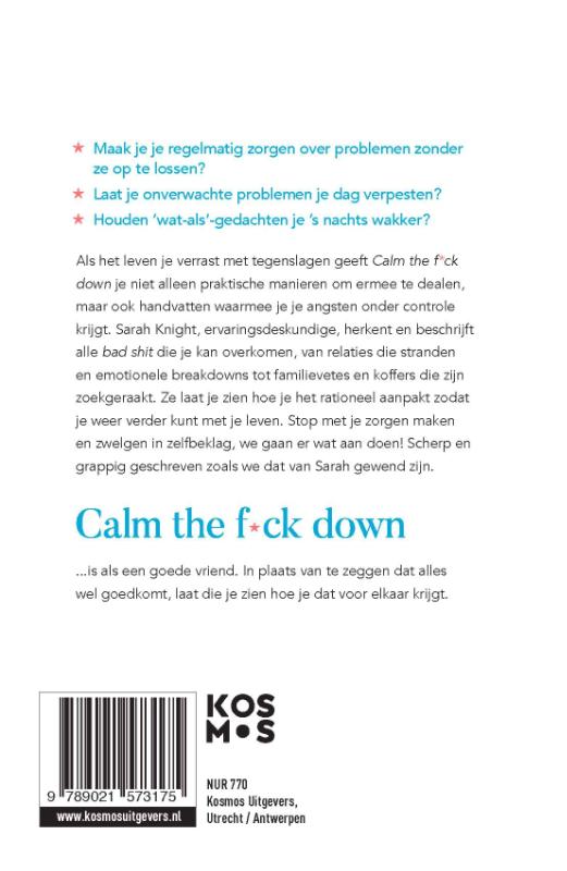 In Calm the f*ck down maak je kennis met de NoWorries-methode van 'anti-goeroe' Sarah Knight. De auteur van bestsellers Don’t give a f*ck en Get your sh*t together helpt om je angsten te temmen en de controle over je leven terug te pakken. Maak je je regelmatig zorgen over problemen zonder ze op te lossen? Laat je onverwachte moeilijkheden je dag verpesten? Houden ‘wat als’-gedachten je ’s nachts wakker? Dan is Calm the f*ck down de oplossing. Scherp, grappig en praktisch geschreven zoals we van Sara Knight gewend zijn.