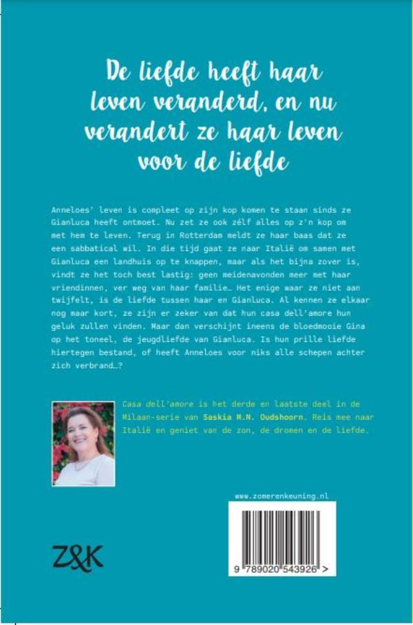Anneloes’ leven is compleet op zijn kop komen te staan sinds ze Gianluca heeft ontmoet. In ‘Casa dell’amore’, het derde en laatste deel van de serie ‘Liefde in Milaan’ door Saskia M.N. Oudshoorn, zet ze ook zélf alles op z’n kop om met hem te leven. Terug in Rotterdam meldt ze haar baas dat ze een sabbatical wil. Ze gaat naar Italië om samen met Gianluca een landhuis op te knappen, maar als het bijna zover is, vindt ze het toch best lastig: geen meidenavonden meer met haar vriendinnen, ver weg van haar familie… Het enige waar ze niet aan twijfelt, is de liefde tussen haar en Gianluca. Al kennen ze elkaar nog maar kort, ze zijn er zeker van dat ze in hun casa dell’amore het geluk zullen vinden. Maar dan verschijnt ineens de bloedmooie Gina op het toneel, Gianluca’s jeugdliefde. Is hun prille liefde hiertegen bestand of heeft Anneloes voor niks alle schepen achter zich verbrand? Je leest het in dit romantische verhaal van Saskia M.N. Oudshoorn. Dus ga mee naar Italië en geniet!