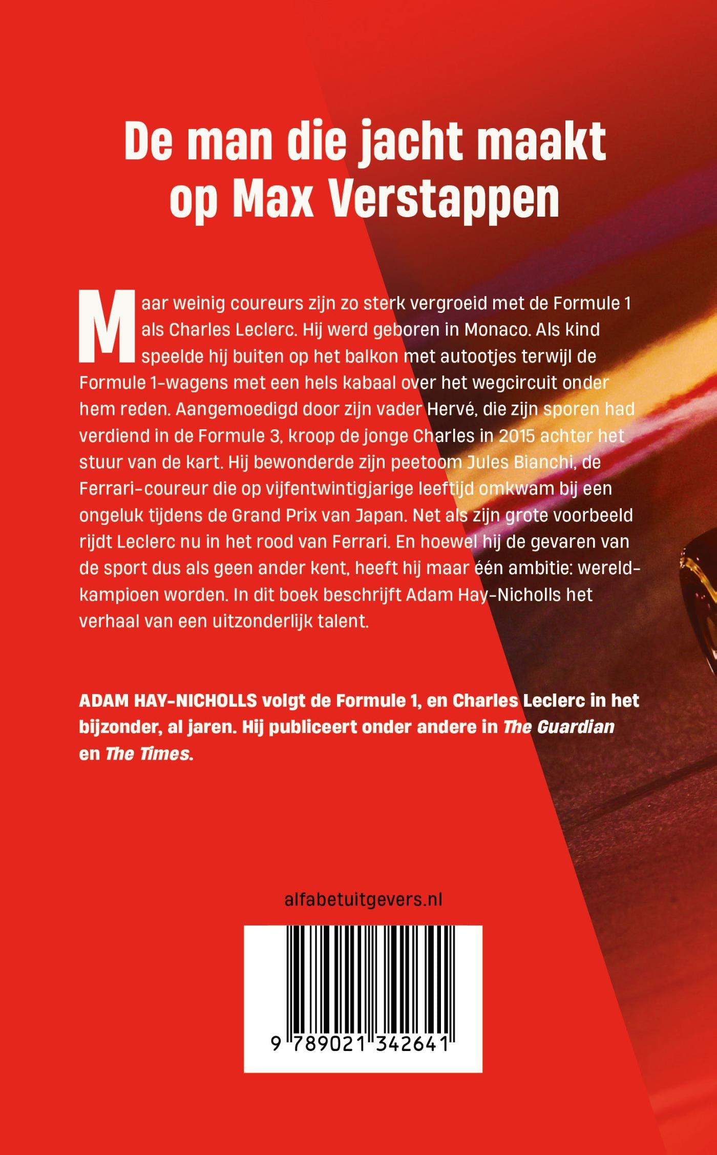 Maar weinig coureurs zijn zo sterk vergroeid met de Formule 1 als Charles Leclerc. Hij werd geboren in Monaco. Als kind speelde hij zittend op het balkon met autootjes terwijl de Formule 1-wagens met een hels kabaal over het wegcircuit onder hem door reden. Aangemoedigd door zijn vader Hervé, die zijn sporen had verdiend in de Formule 3, kroop de jonge Charles in 2015 achter het stuur van de kart. Hij bewonderde zijn peetoom Jules Bianchi, de Ferrari-coureur die op vijfentwintigjarige leeftijd omkwam bij een ongeluk tijdens de Grand Prix van Japan. Net als zijn grote voorbeeld rijdt Leclerc nu in het rood van Ferrari. En hoewel hij de gevaren van de sport dus als geen ander kent, heeft hij maar één ambitie: wereldkampioen worden. In dit boek beschrijft Adam Hay-Nicholls het verhaal van een uitzonderlijk talent.