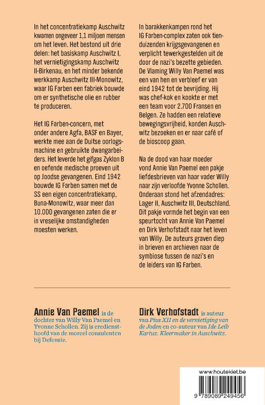 Na de dood van haar moeder vond Annie Van Paemel een pakje liefdesbrieven van haar vader Willy gericht aan zijn verloofde Yvonne Schollen. Onderaan stond het afzendadres: Lager II, Auschwitz III, Deutschland. Dit pakje vormde het begin van een speurtocht van Annie Van Paemel en Dirk Verhofstadt naar het leven van Willy voor en tijdens zijn gedwongen verblijf in Auschwitz iii. Hij was een ‘bevoorrechte’ getuige van de cynische en inhumane manier waarop de SS’ers en IG Farben de gevangenen behandelden. De auteurs graven diep in tal van archieven, brieven en andere documenten naar de symbiose tussen de nazi’s en de louter op winstbejag gerichte leiders van IG Farben die na de oorlog nauwelijks gestraft werden voor hun gruwelijke daden.