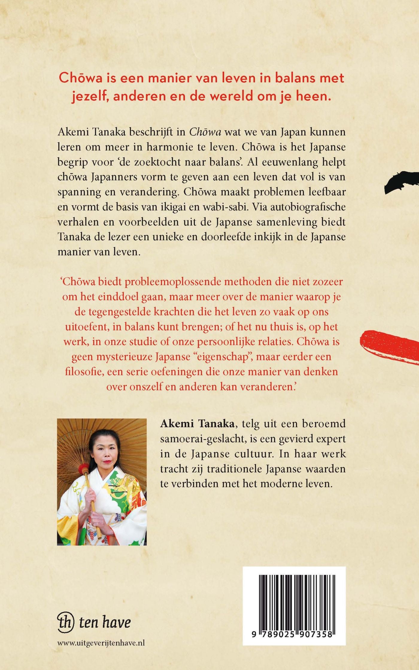 Akemi Tanaka beschrijft in Chowa wat we van Japan kunnen leren om meer in harmonie te leven. Chowa is het Japanse begrip voor ‘de zoektocht naar balans’. Al eeuwenlang helpt chowa Japanners vorm te geven aan een leven dat vol is van spanning en verandering. Chowa maakt problemen leefbaar en vormt de basis van ikigai en wabi sabi.
