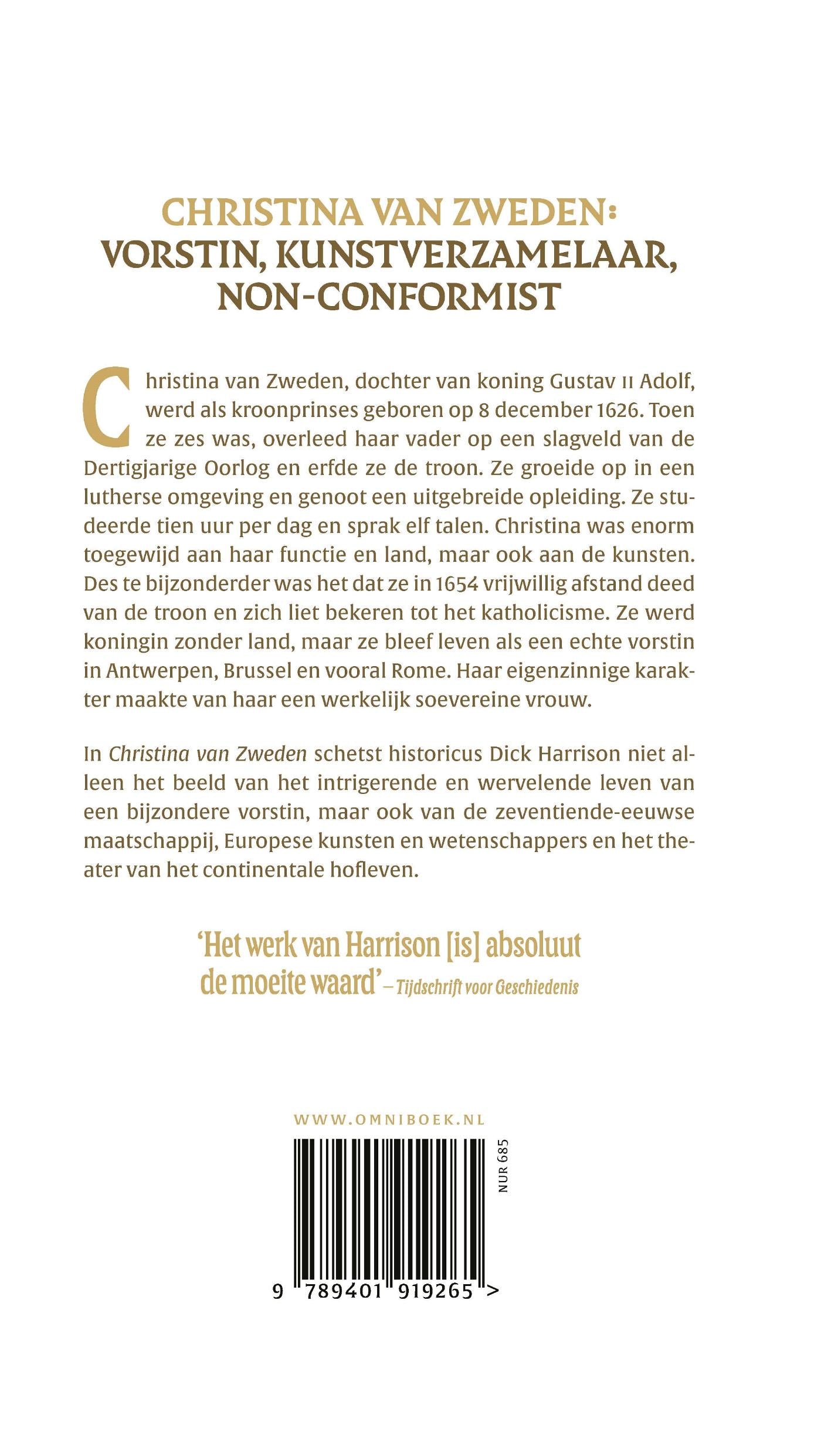 In ‘Christina van Zweden’ vertelt Dick Harrison het levensverhaal van de Zweedse koningin (1626-1689), die in 1654 vrijwillig afstand deed van de troon. Vlak voordat ze zes jaar werd, overleed haar vader, de Zweedse koning Gustav II Adolf, op een slagveld in de Dertigjarige Oorlog en erfde ze de troon. Ze groeide op in een lutherse omgeving en genoot een uitgebreide opleiding. Ze studeerde tien uur per dag en sprak elf talen. Christina was enorm toegewijd aan haar functie en land, maar ook aan de kunsten.