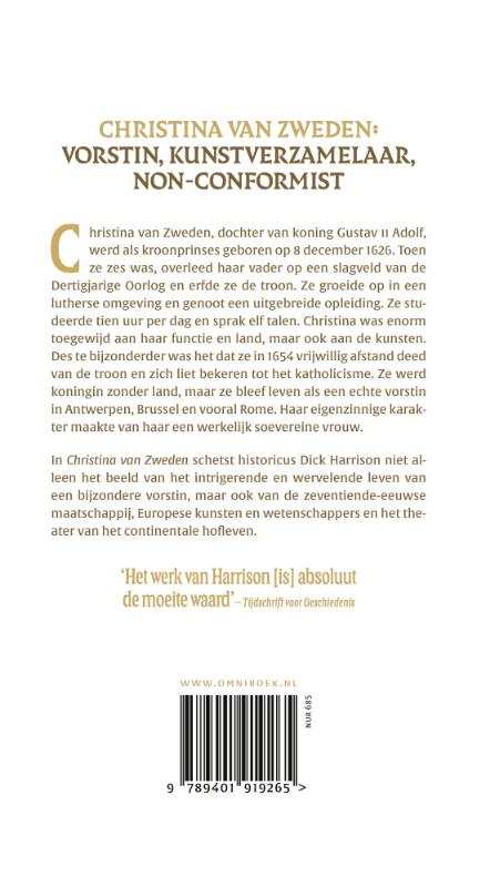 In ‘Christina van Zweden’ vertelt Dick Harrison het levensverhaal van de Zweedse koningin (1626-1689), die in 1654 vrijwillig afstand deed van de troon. Vlak voordat ze zes jaar werd, overleed haar vader, de Zweedse koning Gustav II Adolf, op een slagveld in de Dertigjarige Oorlog en erfde ze de troon. Ze groeide op in een lutherse omgeving en genoot een uitgebreide opleiding. Ze studeerde tien uur per dag en sprak elf talen. Christina was enorm toegewijd aan haar functie en land, maar ook aan de kunsten.