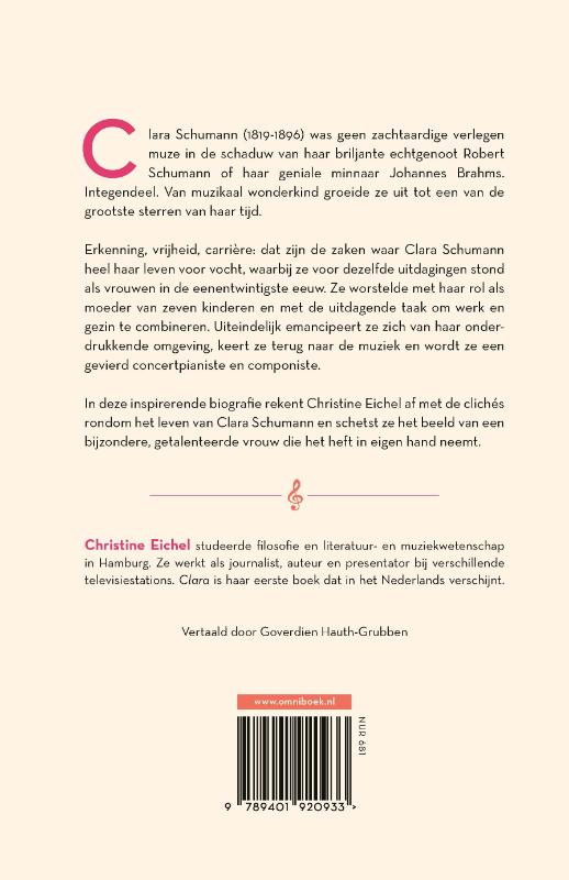 In ‘Clara’ beschrijft Christine Eichel het leven van Clara Schumann. Daarbij rekent ze af met een aantal clichés: Clara Schumann was geen zachtaardige muze in de schaduw van haar briljante echtgenoot. Integendeel. Ondersteund door vele bronnen schetst Eichel het beeld van een bijzondere vrouw die onder het juk van een toxische relatie met de componist Robert Schumann uitkwam.