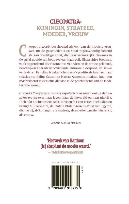 In ‘Cleopatra’ scheidt Dick Harrison feit van fictie en lukt het hem om Cleopatra, de laatste Ptolemaeïsche vorst van Egypte, dichterbij te brengen; als koningin, als politica, als moeder van vier kinderen, als vrouw. Want ondanks haar illustere reputatie is er maar weinig dat we zeker weten over Cleopatra, haar leven, haar denkwereld en haar uiterlijk. Wat we wel weten is opgetekend door Romeinse vijanden en daarmee gekleurd.