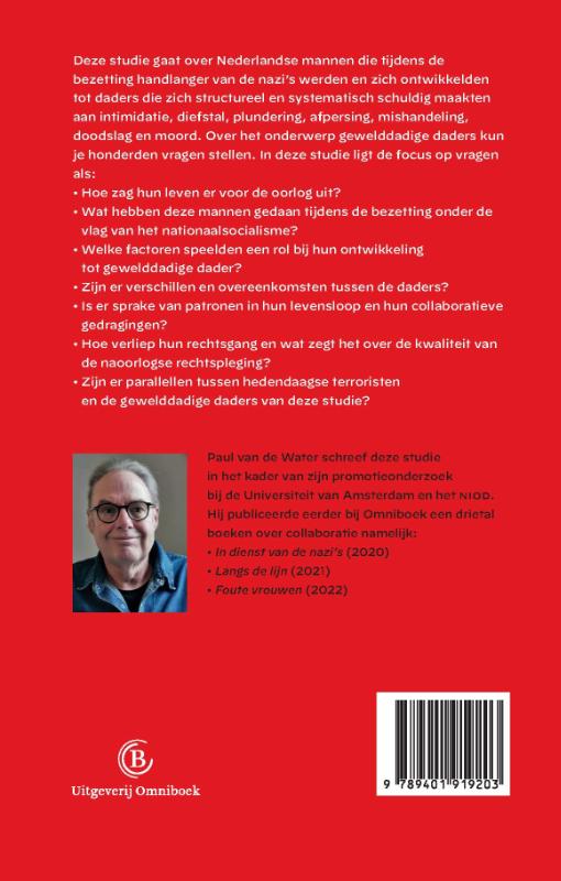 Deze studie gaat over Nederlandse mannen die tijdens de bezetting handlanger van de nazi’s werden en zich ontwikkelden tot daders die zich structureel en systematisch schuldig maakten aan intimidatie, diefstal, plundering, afpersing, mishandeling, doodslag en moord. Over het onderwerp gewelddadige daders kun je honderden vragen stellen. In deze studie ligt de focus op vragen als: Hoe zag hun leven er voor de oorlog uit? Wat hebben deze mannen gedaan tijdens de bezetting onder de vlag van het nationaalsocialisme? Welke factoren speelden een rol bij hun ontwikkeling tot gewelddadige dader? Zijn er verschillen en overeenkomsten tussen de daders? Is er sprake van patronen in hun levensloop en hun collaboratieve gedragingen? Hoe verliep hun rechtsgang en wat zegt het over de kwaliteit van de naoorlogse rechtspleging? Zijn er parallellen tussen hedendaagse terroristen en de gewelddadige daders van deze studie?