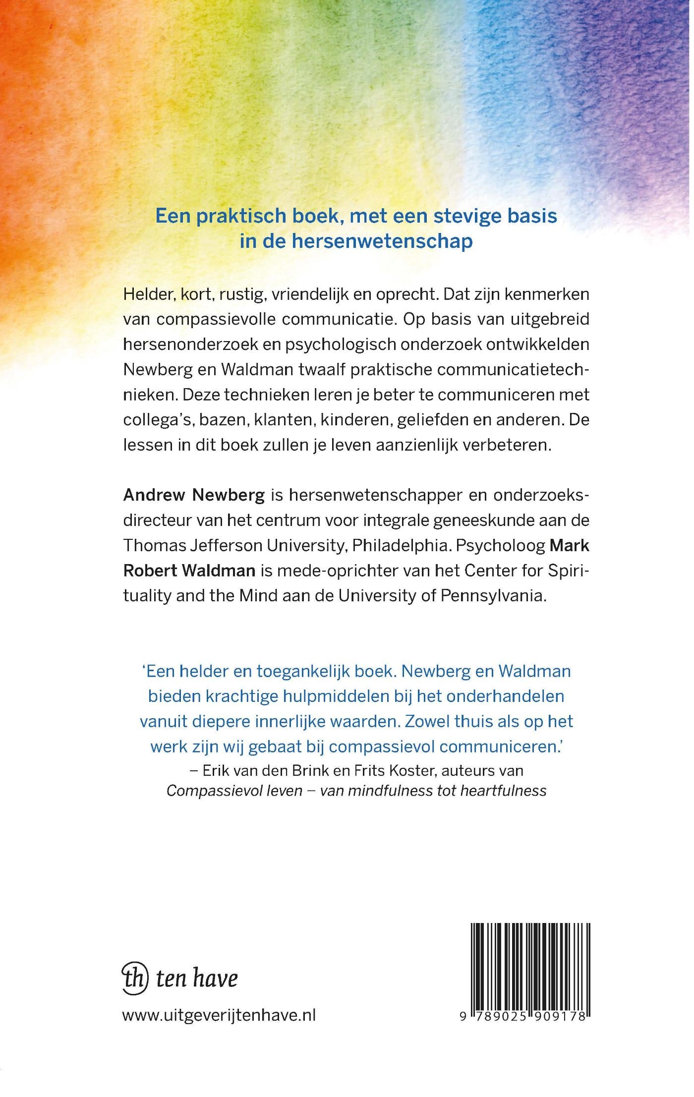 Helder, kort, rustig, vriendelijk en oprecht. Dat zijn kenmerken van compassievolle communicatie. Op basis van uitgebreid hersenonderzoek en psychologisch onderzoek ontwikkelden Newberg en Waldman twaalf praktische communicatietechnieken. Deze technieken leren je beter te communiceren met collega’s, bazen, klanten, kinderen, geliefden en anderen. De lessen in dit boek zullen je leven ingrijpend verbeteren.