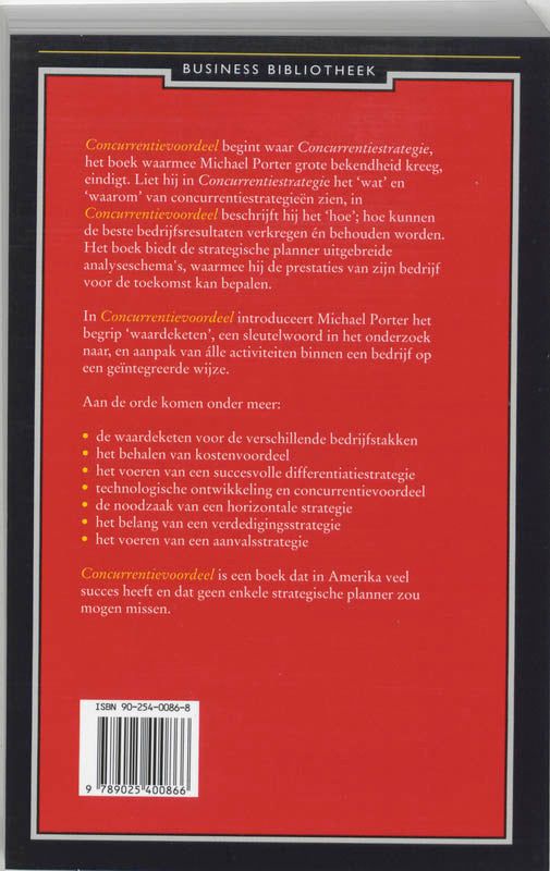 Liet Michael Porter in 'Concurrentiestrategie' het wat en waarom van concurrentiestrategieën zien, in dit boek beschrijft hij het hoe; hoe kunnen de beste bedrijfsresultaten verkregen én behouden worden. Het boek biedt je uitgebreide analyseschema's waarmee je de prestaties van je bedrijf voor de toekomst kan bepalen. Porter introduceert het begrip 'waardeketen', een sleutelwoord in het onderzoek naar, en aanpak van álle activiteiten binnen een bedrijf op een geïntegreerde wijze. Aan de orde komen onder meer: