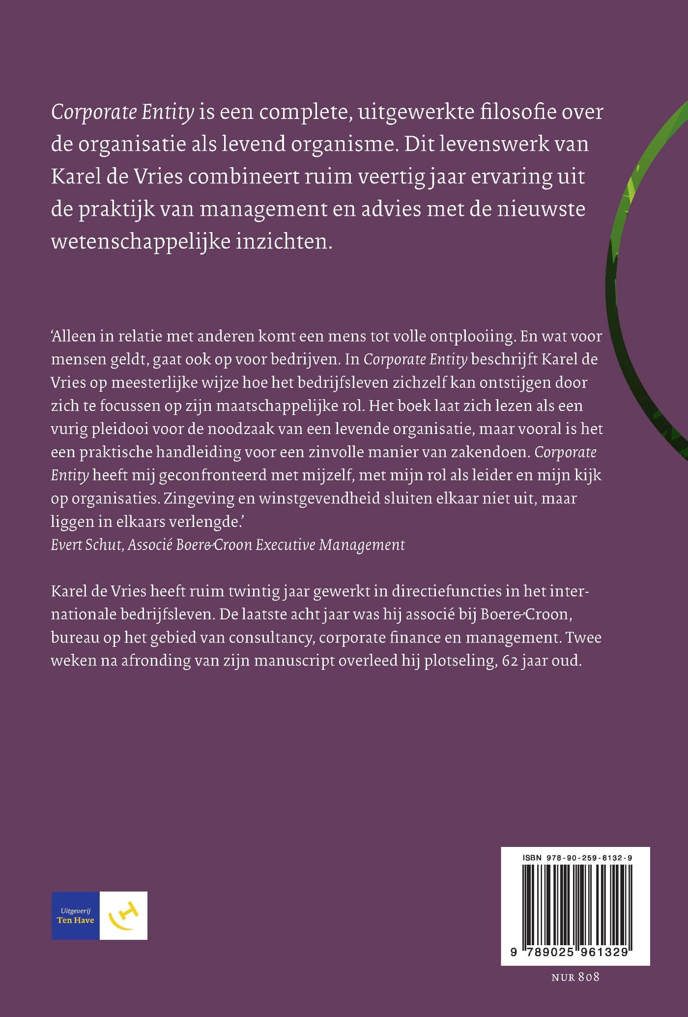 Corporate Entity is een complete, uitgewerkte filosofie over de organisatie als levend organisme. Dit levenswerk van Karel de Vries combineert ruim veertig jaar ervaring uit de praktijk van management en advies met de nieuwste wetenschappelijke inzichten.