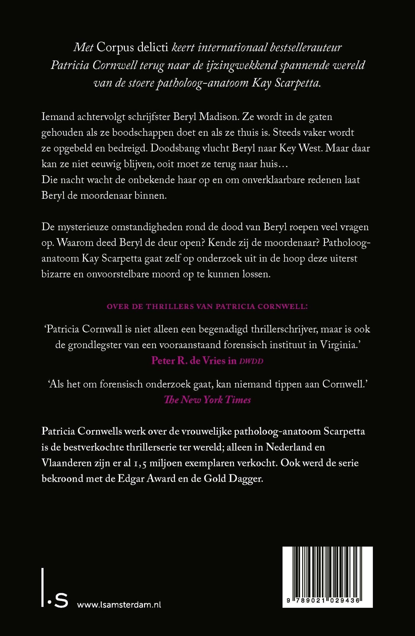 Patricia Cornwells werk over de vrouwelijke patholoog-anatoom Scarpetta is de bestverkochte thrillerserie ter wereld; alleen in Nederland en Vlaanderen zijn er al 1,5 miljoen exemplaren verkocht. Ook werd de serie bekroond met de Edgar Award en de Gold Dagger.