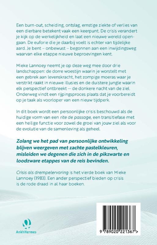 Je bent – onbewust – begonnen aan een inwijdingsweg waarvan elke etappe nieuwe beproevingen kent die tot steeds meer bewustwording leiden. Mieke Lannoey neemt je in Crisis als drempelervaring mee door drie landschappen op deze weg: de dorre woestijn waarin je worstelt met een gebrek aan levenskracht, het zompige moeras waar je verstrikt raakt in nieuwe illusies en de duistere jungle waarin elk perspectief ontbreekt – de donkere nacht van de ziel.
