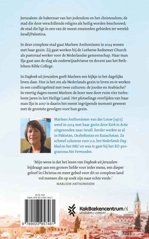 In ‘Dagboek uit Jeruzalem’ vertelt Marleen Anthonissen veertig verhalen over haar leven – en het leven van alledag – in de Heilige Stad. Sinds 2014 woont en werkt Marleen in Jeruzalem. Ze is daar pastoraal werker bij de Lutherse Redeemer Church voor de Nederlandse gemeenschap in en rond Jeruzalem en geeft voorlichting aan Nederlandse bezoekers. Ingrijpend was het onverwachte overlijden van haar echtgenoot Ilja in 2017. Marleen Anthonissen-van der Louw werd in 2014 met haar gezin door Kerk in Actie uitgezonden naar Israël. Eerder werkte ze al in Pakistan, Oezbekistan en Kazachstan.