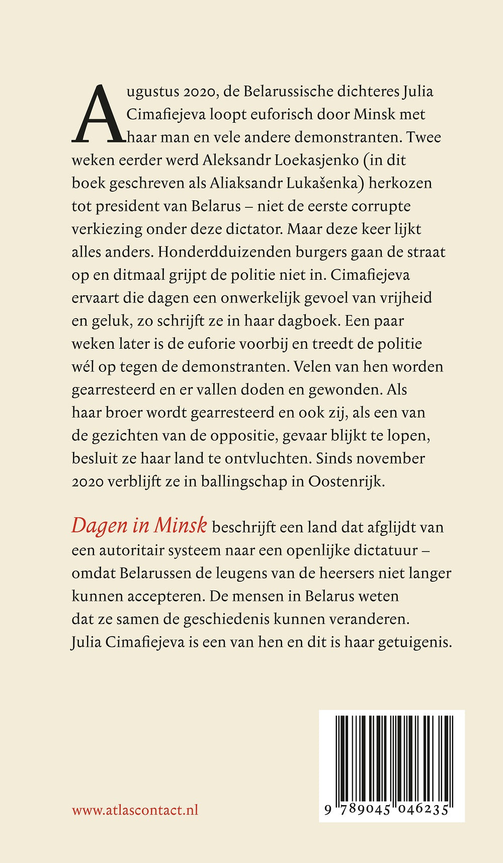 In ‘Dagen in Minsk’ loopt de Belarussische dichteres Julia Cimafiejeva in augustus 2020 euforisch door Minsk met vele andere demonstranten. Twee weken eerder werd Aleksandr Loekasjenko herkozen tot president van Belarus. Door de corrupte verkiezing gaan honderdduizenden burgers de straat op, eerst grijpt de politie niet in, maar een paar euforische weken later treedt de politie wél op, velen van de demonstranten worden gearresteerd en er vallen doden en gewonden. Als haar broer wordt gearresteerd en ook Julia Cimafiejeva gevaar blijkt te lopen, besluit ze haar land te ontvluchten. Sinds november 2020 verblijft ze in ballingschap in Oostenrijk. ‘Dagen in Minsk’ beschrijft een land dat afglijdt van een autoritair systeem naar een openlijke dictatuur – omdat de Belarussen de leugens van de heersers niet langer accepteren en de geschiedenis willen veranderen. Julia Cimafiejeva is een van hen en dit is haar getuigenis.