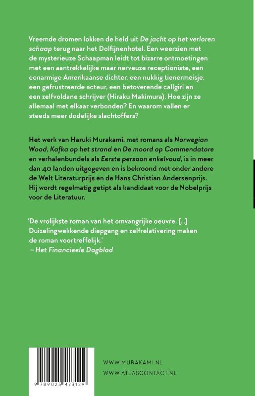 Flirten met de grens tussen droom en werkelijkheid, de zoektocht naar menselijk contact in de hyperkapitalistische maatschappij en vlijmscherpe muzikale analyses vormen de ingrediënten van deze roman, die Haruki Murakami naar eigen zeggen de leukste vond om te schrijven.
