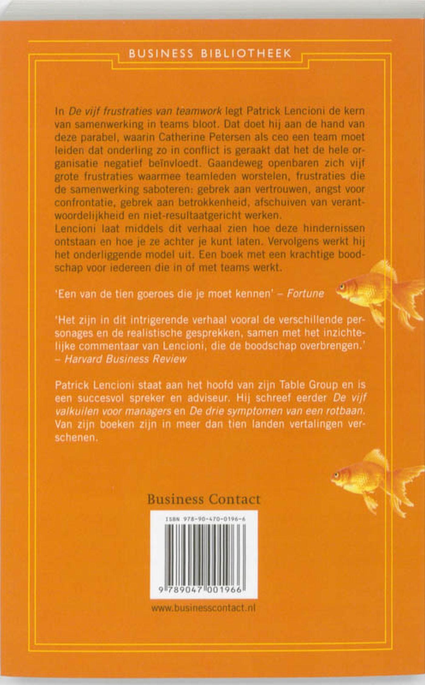 In De vijf frustraties van teamwork legt Patrick Lencioni de kern van samenwerking in teams bloot. Dat doet hij aan de hand van deze parabel, waarin Catherine Petersen als ceo een team moet leiden dat onderling zo in conflict is geraakt dat het de hele organisatie negatief beïnvloedt. Gaandeweg openbaren zich vijf grote frustraties waarmee teamleden worstelen, frustraties die de samenwerking saboteren: gebrek aan betrokkenheid, afschuiven van verantwoordelijkheid en niet-resultaatgericht werken.