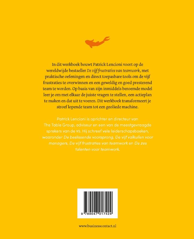 In dit werkboek bouwt Patrick Lencioni voort op de wereldwijde bestseller De vijf frustraties van teamwork, met praktische oefeningen en direct toepasbare tools om de vijf frustraties te overwinnen en een geweldig en goed presterend team te worden. Op basis van zijn inmiddels beroemde model leer je om met elkaar de juiste vragen te stellen, een actieplan te maken en dat uit te voeren. Dit werkboek transformeert je stroef lopende team tot een geoliede machine.