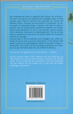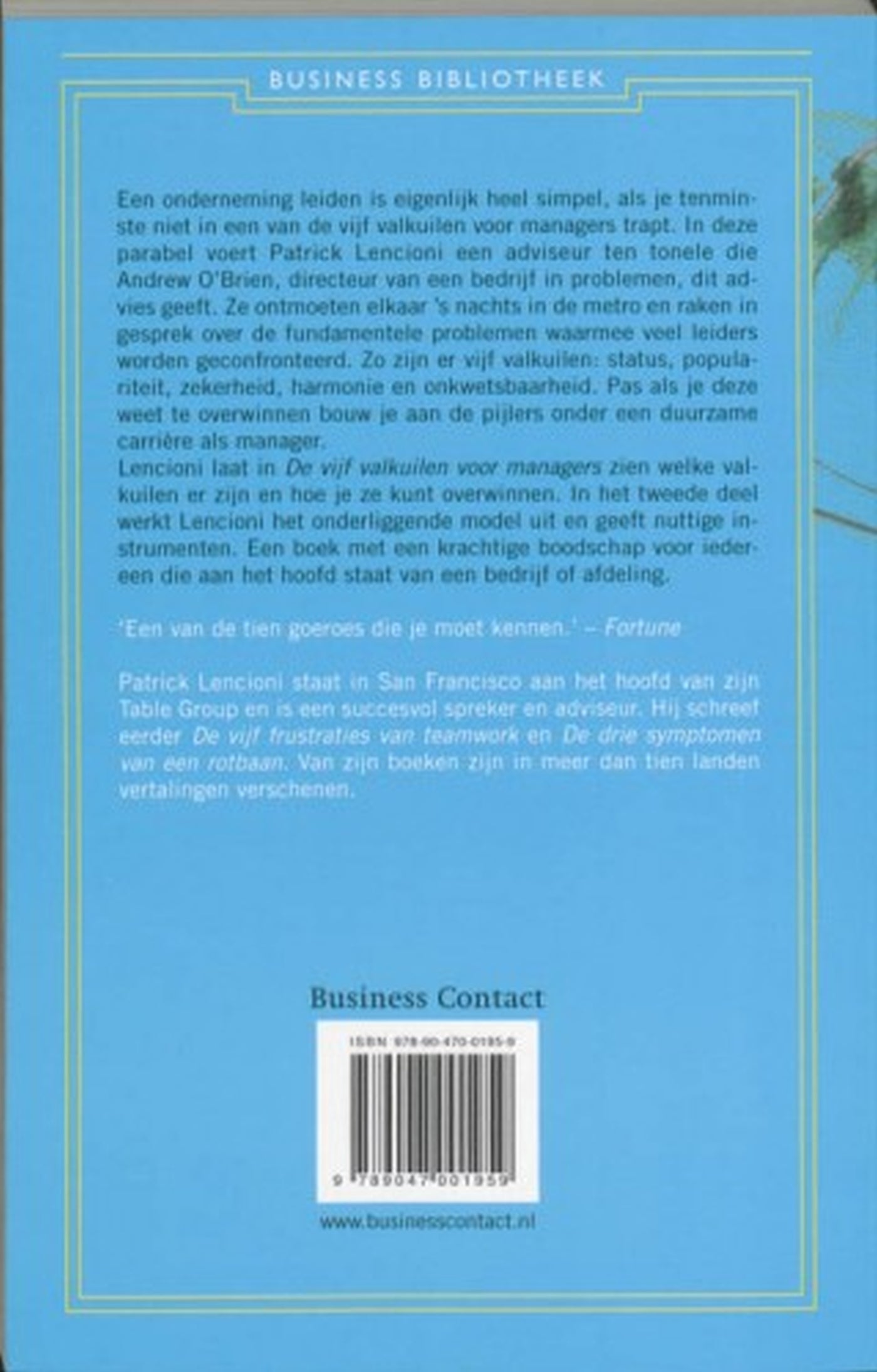 Een onderneming leiden is eigenlijk heel simpel, als je tenminste niet in een van de vijf valkuilen voor managers trapt. In deze parabel voert Patrick Lencioni een adviseur ten tonele die Andrew O’Brien, directeur van een bedrijf in problemen, dit advies geeft. Ze ontmoeten elkaar ’s nachts in de metro en raken in gesprek over de fundamentele problemen waarmee veel leiders worden geconfronteerd. Zo zijn er vijf valkuilen: status, populariteit, zekerheid, harmonie en onkwetsbaarheid. Pas als je deze weet te overwinnen bouw je aan de pijlers onder een duurzame carrière als manager.