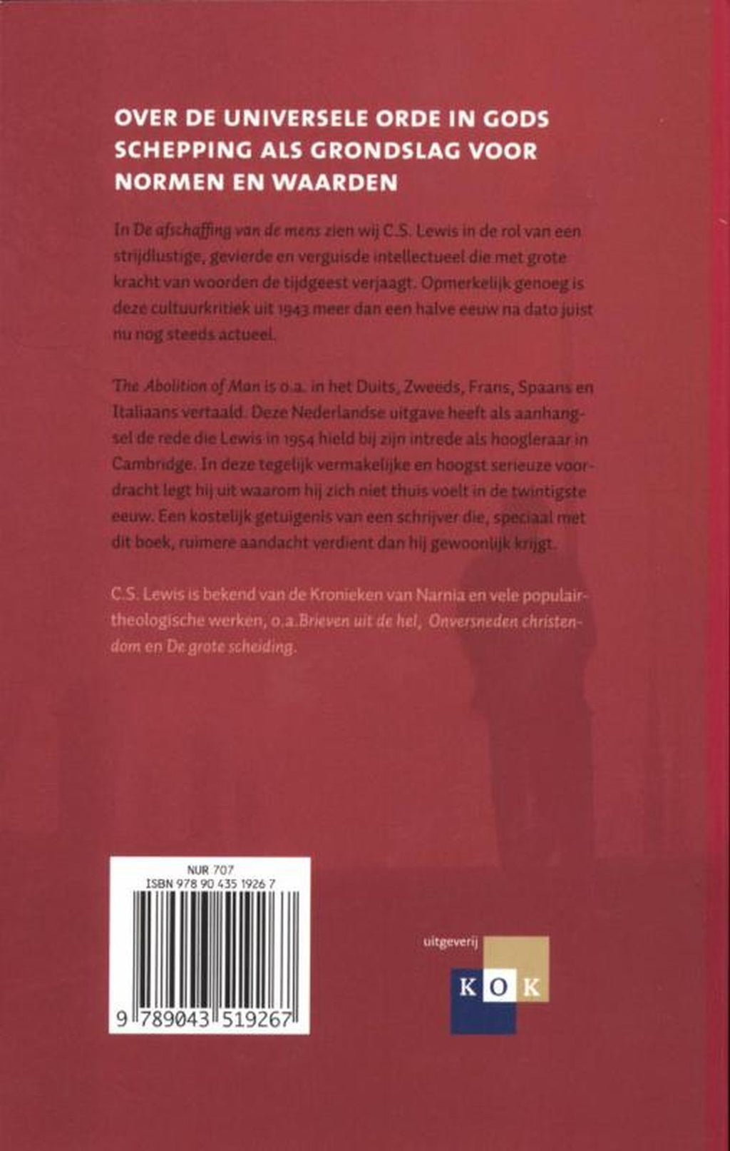 Over de universele orde in Gods schepping als grondslag voor normen en waarden. In De afschaffing van de men zien wij C.S. Lewis in de rol van een strijdlustige, gevierde en verguisde intellectueel die met grote kracht van woorden de tijdgeest verjaagt. Opmerkelijk genoeg is deze cultuurkritiek uit 1943 meer dan een halve eeuw na dato juist nu nog steeds actueel.