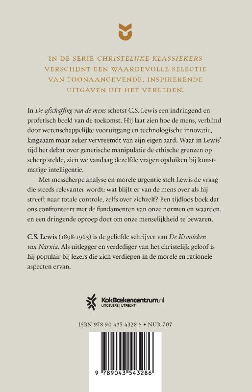 In ‘De afschaffing van de mens’ schetst C.S. Lewis de toekomst van de mens, die door ontwikkelingen in wetenschap en techniek vervreemd raakt van zijn menselijke identiteit. In Lewis’ tijd speelde het ethische dilemma van genetische manipulatie. In deze tijd kun je denken aan de toepassing van kunstmatige intelligentie. Dit profetische boek laat zien waar de mens ophoudt mens te zijn en doet een dringend appel op het fundament van onze normen en waarden.