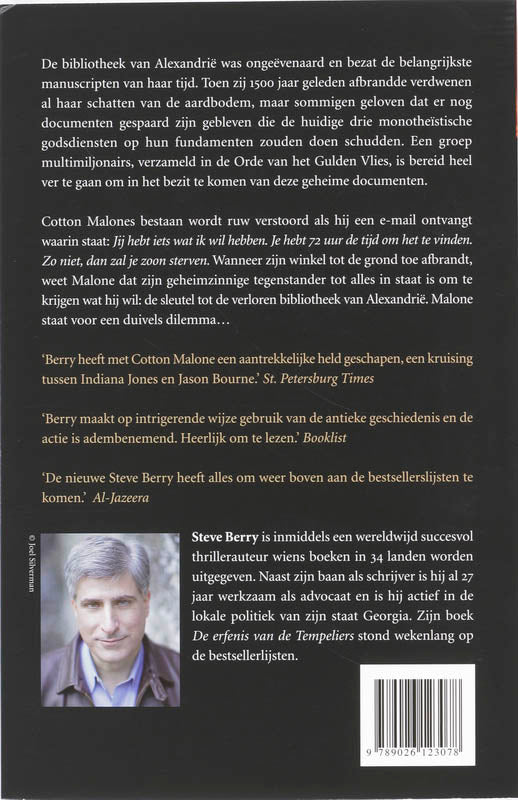 Cotton Malone (2) De bibliotheek van Alexandrië bezat de belangrijkste manuscripten van haar tijd. Toen zij 1500 jaar geleden afbrandde verdwenen alle schatten van de aardbodem, maar sommigen geloven dat er nog documenten gespaard zijn gebleven die de huidige drie monotheïstische godsdiensten op hun fundamenten zouden doen schudden. Een groep multimiljonairs, verzameld in de Orde van het Gulden Vlies, is bereid heel ver te gaan om in het bezit te komen van deze documenten.