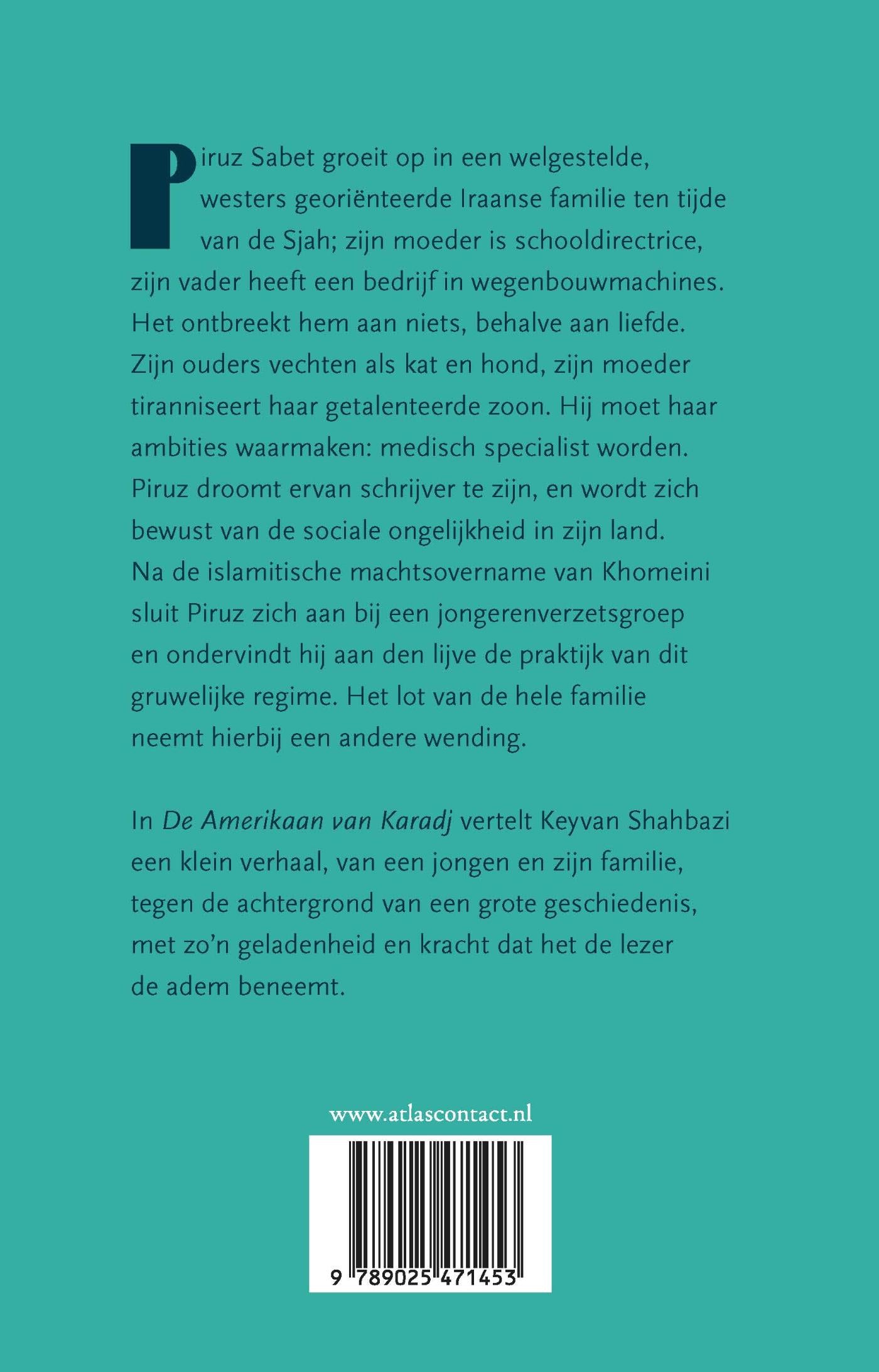 In ‘De Amerikaan van Karadj’ vertelt Keyvan Shahbazi een klein verhaal, van een jongen en zijn familie, tegen de achtergrond van een grote geschiedenis. Piruz Sabet groeit op in een welgestelde, westers georiënteerde Iraanse familie ten tijde van de Sjah; zijn moeder is schooldirectrice, zijn vader heeft een bedrijf in wegenbouwmachines. Het ontbreekt hem aan niets, behalve aan liefde. Zijn ouders vechten als kat en hond, zijn moeder tiranniseert haar getalenteerde zoon. Hij moet haar ambities waarmaken: medisch specialist worden. Piruz droomt ervan schrijver te zijn, en wordt zich bewust van de sociale ongelijkheid in zijn land. Na de islamitische machtsovername van Khomeini sluit Piruz zich aan bij een jongerenverzetsgroep en ondervindt hij aan den lijve de praktijk van dit gruwelijke regime. Het lot van de hele familie neemt hierbij een andere wending.