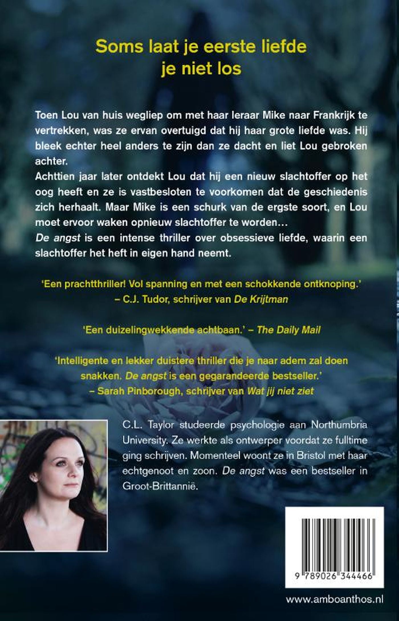 In ‘De angst’ van C.L. Taylor loopt Lou van huis weg om met haar leraar Mike naar Frankrijk te vertrekken. Ze is ervan overtuigd dat hij haar grote liefde is, maar hij blijkt heel anders in elkaar te zitten en laat Lou gebroken achter. Achttien jaar later ontdekt Lou dat hij een nieuw slachtoffer op het oog heeft en ze is vastbesloten te voorkomen dat de geschiedenis zich herhaalt. Maar Mike is een schurk van de ergste soort, en Lou moet ervoor waken opnieuw slachtoffer te worden…