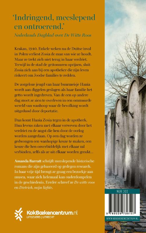 Krakau, 1940. In ‘De apotheek in het getto’ van Amanda Barratt kent Zosia Lewandowska de wrede realiteit van de oorlog maar al te goed. Binnen enkele weken na de Duitse inval in Polen verliest ze de man van wie ze hield. Terwijl de gettomuren oprijzen, sluit Zosia zich aan bij een Poolse apotheker die zijn leven riskeert om Joodse families te redden.