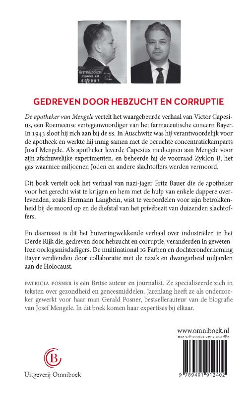 Patricia Posner beschrijft in 'De apotheker van Mengele' het waargebeurde verhaal van Victor Capesius. Deze vriendelijke artsenbezoeker van farmaceutisch bedrijf Bayer ging in 1943 bij de SS en beheerde in Auschwitz het dodelijke gas Zyklon B. Hij leverde medicijnen voor de experimenten van gruwelarts Josef Mengele. Het is ook het verhaal van nazi-jager Frits Bauer, die de apotheker voor het gerecht wist te krijgen. En ten slotte is dit het huiveringwekkende verhaal over Bayer/IG Farben, dat door collaboratie met de nazi's en dwangarbeid miljarden verdiende aan de Holocaust. Een onbekend hoofdstuk de Tweede Wereldoorlog, grondig onderzocht.