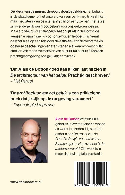 In 'De architectuur van het geluk' beschrijft Alain de Botton de wensen en eisen die wij voor onze huizen hebben. Hij neemt de lezer mee op een reis door de esthetiek van de westerse en oosterse beschavingen en stelt vragen als: waarom verschillen mensen en volken zoveel in smaak? Kan een prachtige omgeving ons gelukkiger maken?