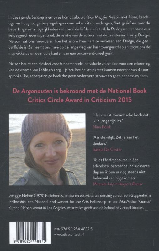 In 'De argonauten' komt Maggie Nelson met frisse, krachtige en hoognodige overpeinzingen over seksualiteit, verlangen en ‘familie’, en de beperkingen en mogelijkheden van zowel de liefde als de taal. In 'De Argonauten' staat een liefdesgeschiedenis centraal: de relatie van de auteur met de kunstenaar Harry Dodge. Nelson laat ons van binnenuit zien hoe het is om verliefd te worden op Dodge, die genderfluïde is. Ze neemt ons mee op de lange weg van een zwangerschap, en ze toont ons de ingewikkelde en de mooie kanten van een gezin dat afwijkt van de norm.