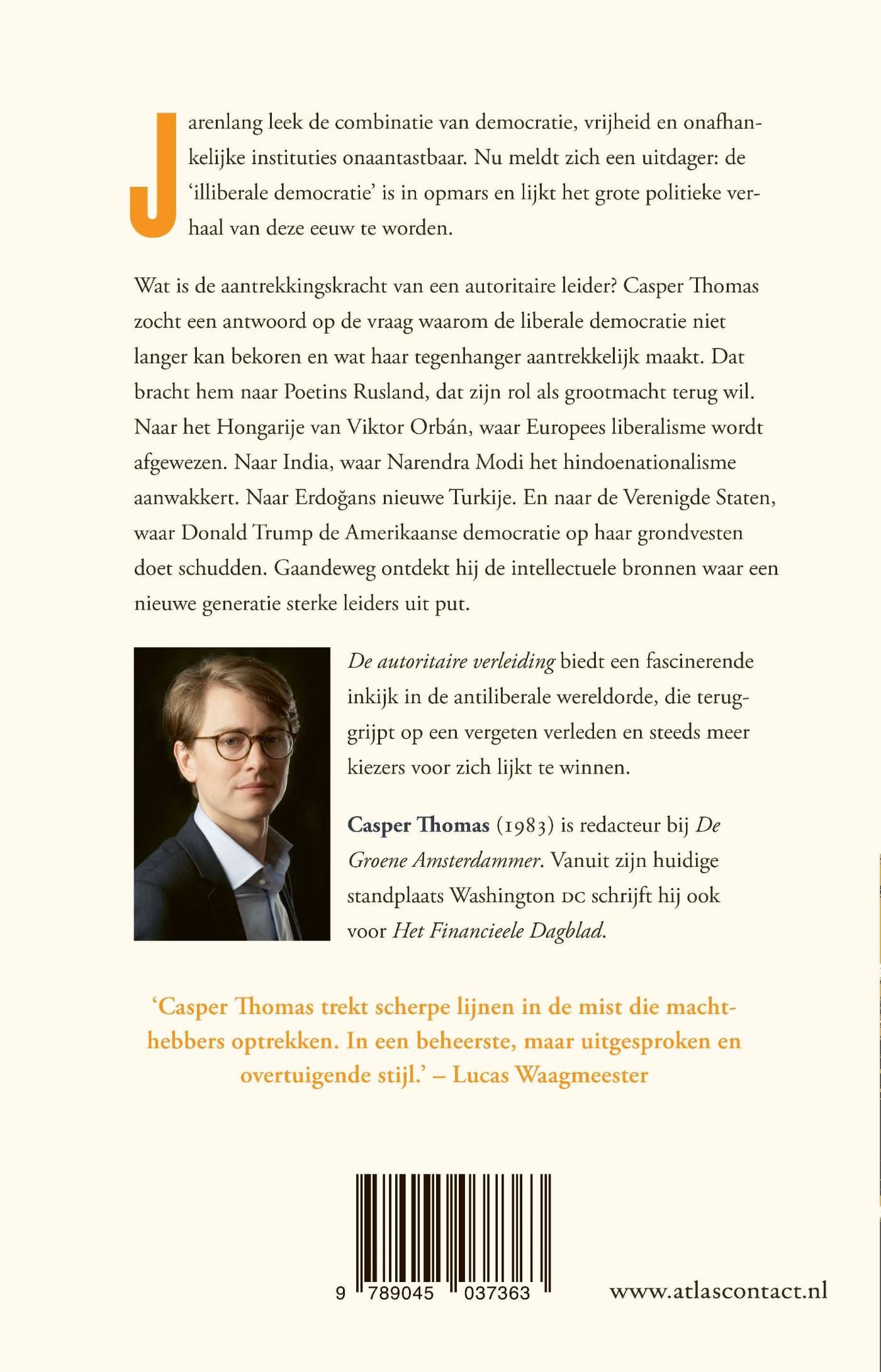 In ‘De autoritaire verleiding’ onderzoekt journalist Casper Thomas vijf landen die de liberale democratie afwijzen en de rug toekeren. Jarenlang leek de combinatie van democratie, vrijheid en onafhankelijke instituties namelijk onaantastbaar. Nu meldt zich een uitdager: de ‘illiberale democratie’ is in opmars en lijkt het grote politieke verhaal van deze eeuw te worden. Wat is de aantrekkingskracht van een autoritaire leider? Casper Thomas zocht een antwoord op de vraag waarom de liberale democratie niet langer kan bekoren en wat haar tegenhanger aantrekkelijk maakt. Dat bracht hem naar Poetins Rusland, dat zijn rol als grootmacht terug wil. Naar het Hongarije van Viktor Orbán, waar Europees liberalisme wordt afgewezen. Naar India, waar Narendra Modi het hindoenationalisme aanwakkert. Naar Erdogans nieuwe Turkije. En naar de Verenigde Staten, waar Donald Trump de Amerikaanse democratie op haar grondvesten doet schudden. Gaandeweg ontdekt hij de intellectuele bronnen waar een nieuwe generatie sterke leiders uit put.