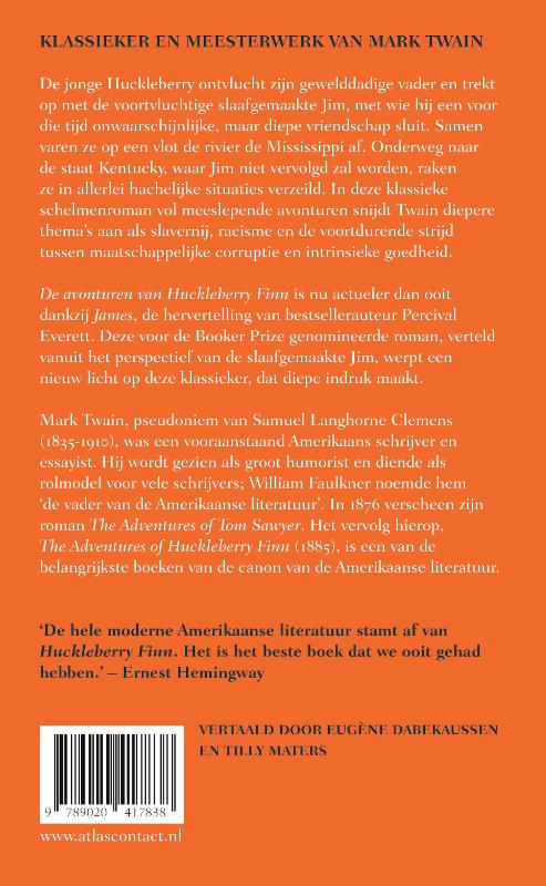 Het meesterwerk van de Amerikaanse auteur Mark Twain (pseudoniem van Samuel Langhorne Clemens, 1835-1910). Twain snijdt in ‘De avonturen van Huckleberry Finn’ thema’s als slavernij, racisme en de voortdurende strijd tussen maatschappelijke corruptie en intrinsieke goedheid aan. De jonge Huckleberry ontvlucht zijn gewelddadige vader en trekt op met de voortvluchtige slaaf Jim, met wie hij een voor die tijd onwaarschijnlijke, maar diepe vriendschap sluit. Samen varen ze op een vlot de rivier de Mississippi af. Onderweg naar de staat Kentucky, waar Jim niet vervolgd zal worden, raken ze in allerlei hachelijke situaties verzeild.