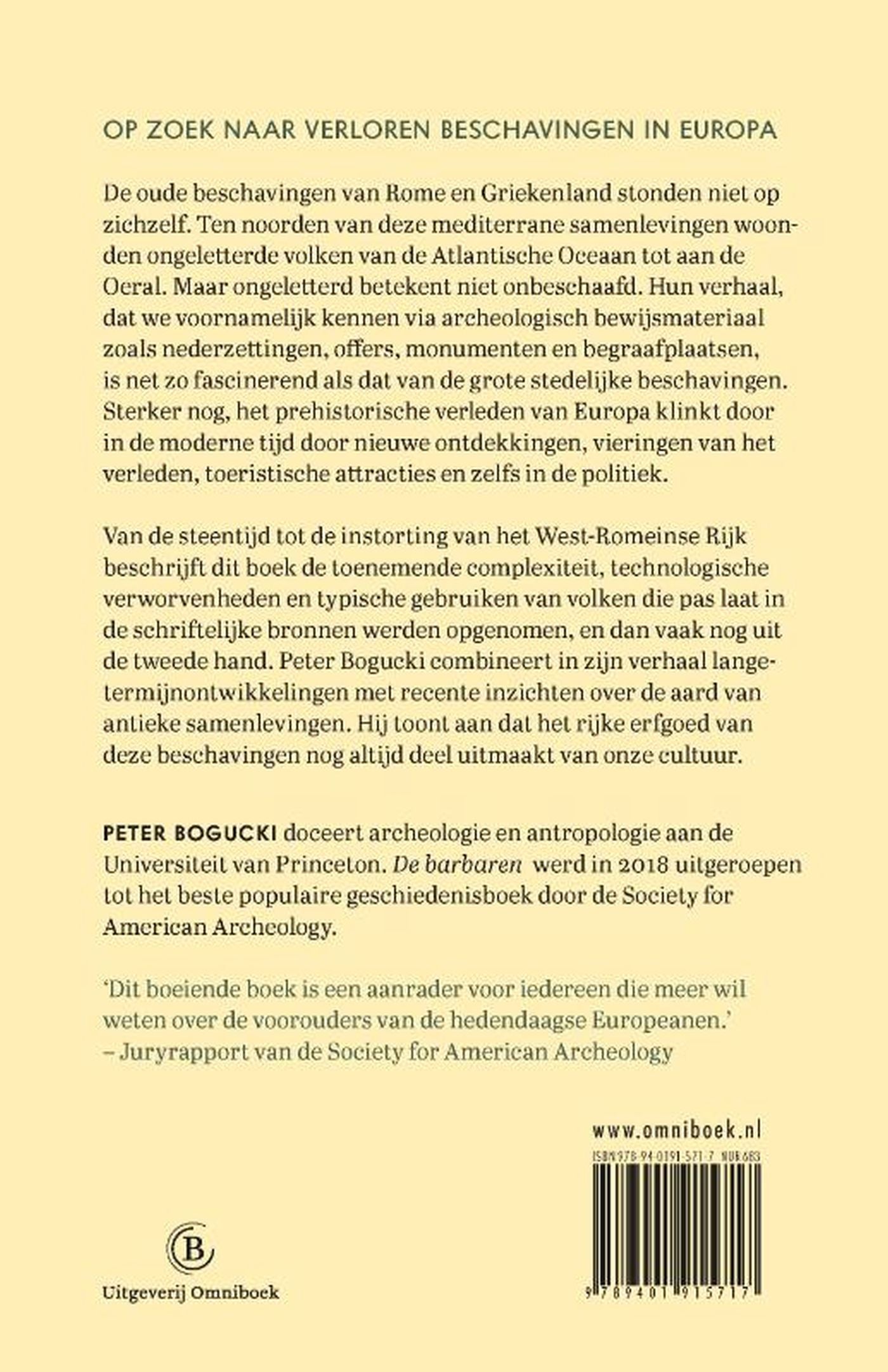 ‘De Barbaren’ van historicus Peter Bogucki geeft een schitterend overzicht van de voorouders van de hedendaagse Europeanen. De oude beschavingen van Rome en Griekenland stonden niet op zichzelf. Ten noorden van deze mediterrane samenlevingen leefden ongeletterde volkeren, van de Atlantische Oceaan tot aan de Oeral. Ongeletterd betekent niet onbeschaafd. In dit pan-Europese boek vertelt Bogucki aan de hand van archeologische vondsten over de culturen en volkeren van West- en Midden-Europa – ook van Nederland en België – en geeft hij inzicht in ons Europees verleden.