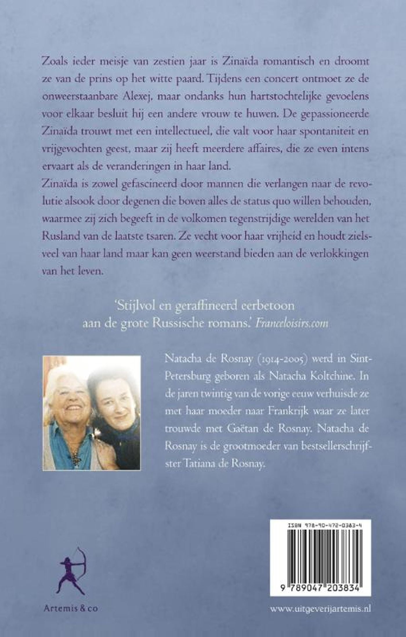 `Haar naam was Zinaïda, een jong meisje van goede komaf met een opvliegend temperament, geboren in een voorrevolutionair Sint-Petersburg, in de tsarentijd. Dit boek schetst haar leven, waarin zij heen en weer wordt geworpen tussen verstand en gevoel tegen de achtergrond van een land aan de vooravond van een revolutie. Aan het einde van haar leven in het familiehuis in Odessa, aan de Zwarte Zee in Rusland, vraagt zij aan haar achterkleinkind haar geschiedenis op te tekenen. Mijn oma, Natacha de Rosnay, heeft deze belofte gehouden en ik weet zeker dat u gegrepen zult worden door de rauwe romantiek die doet denken aan een Russische versie van Gejaagd door de wind.