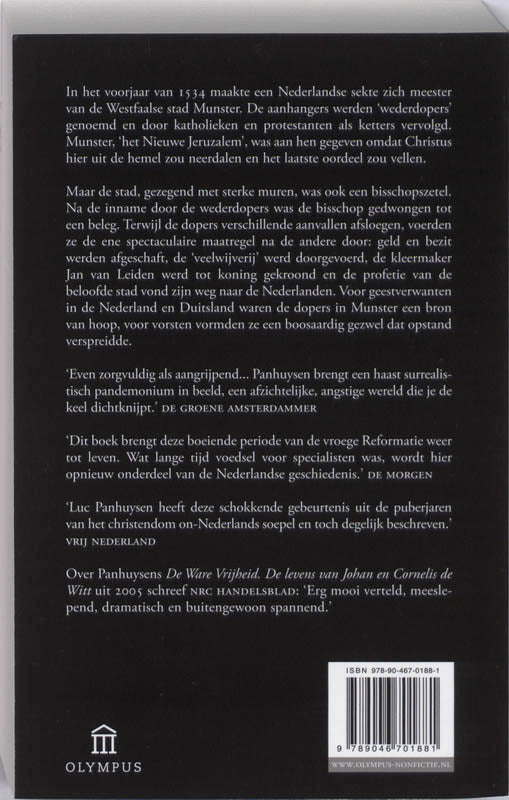 In “De beloofde stad” van Luc Panhuysen gaan we naar het voorjaar van 1534 waar een Nederlandse sekte zich meester maakte van de Westfaalse stad Munster. De aanhangers werden ‘wederdopers’ genoemd en door katholieken en protestanten als ketters vervolgd. In dit ‘Nieuwe Jeruzalem’ wachtten de wederdopers op het laatste oordeel en voerden ze de ene spectaculaire maatregel na de andere door: bezit werd afgeschaft, ‘veelwijverij’ werd doorgevoerd en Jan van Leiden, een kleermaker, werd tot koning gekroond. Voor geestverwanten in Nederland en Duitsland waren de dopers in Munster een bron van hoop. Maar voor vorsten vormden ze een boosaardige plaag die moest worden uitgeroeid.