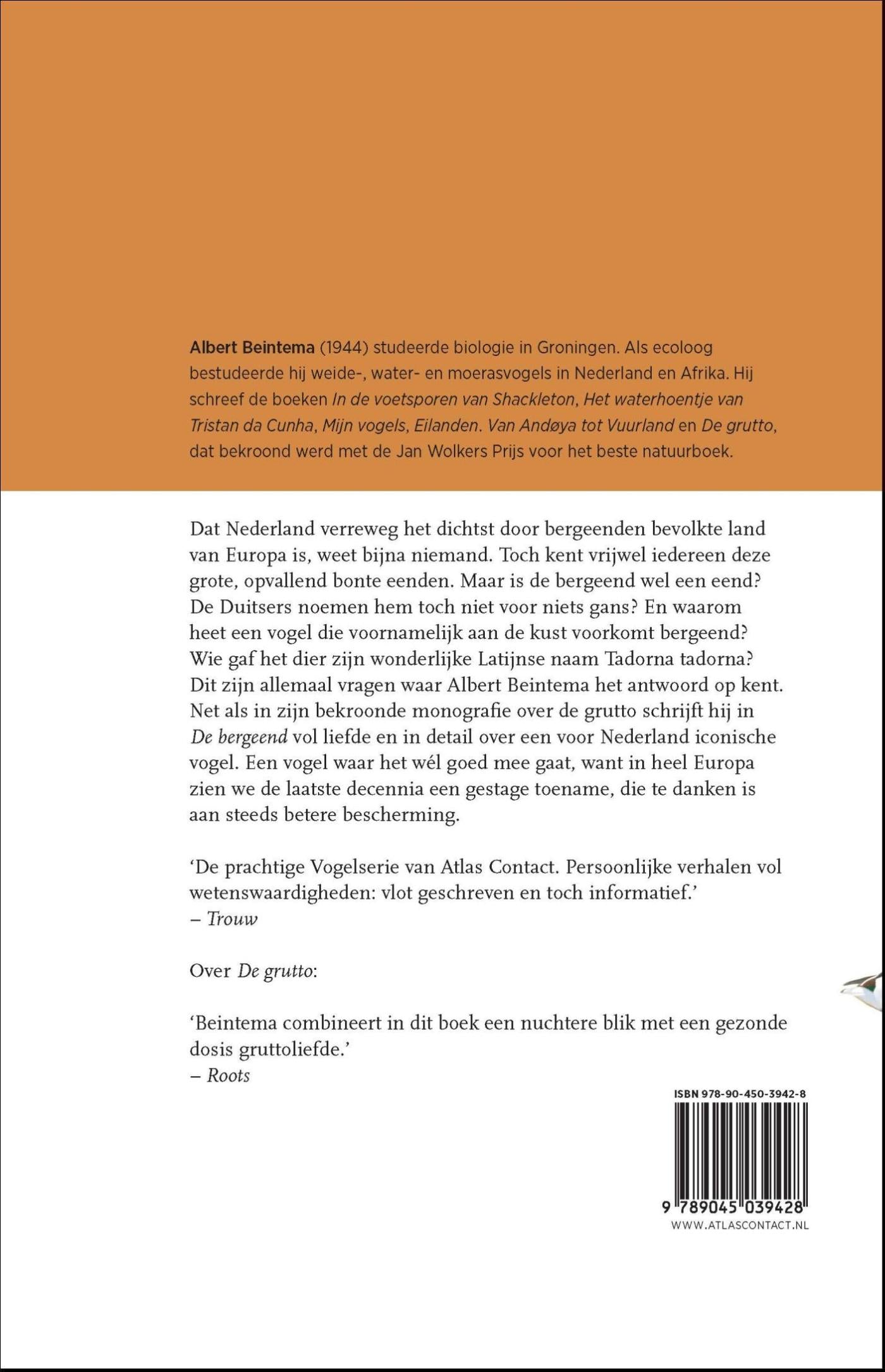 Dat Nederland verreweg het dichtst door bergeenden bevolkte land is, weet bijna niemand. Toch kent vrijwel iedereen deze grote, opvallend bonte eenden; zwart met wit op de rug, een glanzend groene kop met felrode snavel, en een witte borst en buik, met over de borst een vurige roodbruine dwarsband. Maar is die grote bergeend wel een eend? De Duitsers noemen hem toch niet voor niets ‘gans’? En waarom heet een vogel die voornamelijk aan de kust voorkomt bergeend? Wie gaf het dier zijn wonderlijke Latijnse naam Tadorna tadorna? Dit zijn allemaal vragen waar Albert Beintema het antwoord op kent. Net als in zijn bekroonde monografie over de grutto schrijft hij in De bergeend vol liefde en in detail over een voor Nederland iconische vogel. Een vogel waar het wél goed mee gaat, want in heel Europa zien we de laatste decennia een gestage toename, die te danken is aan steeds betere bescherming.
