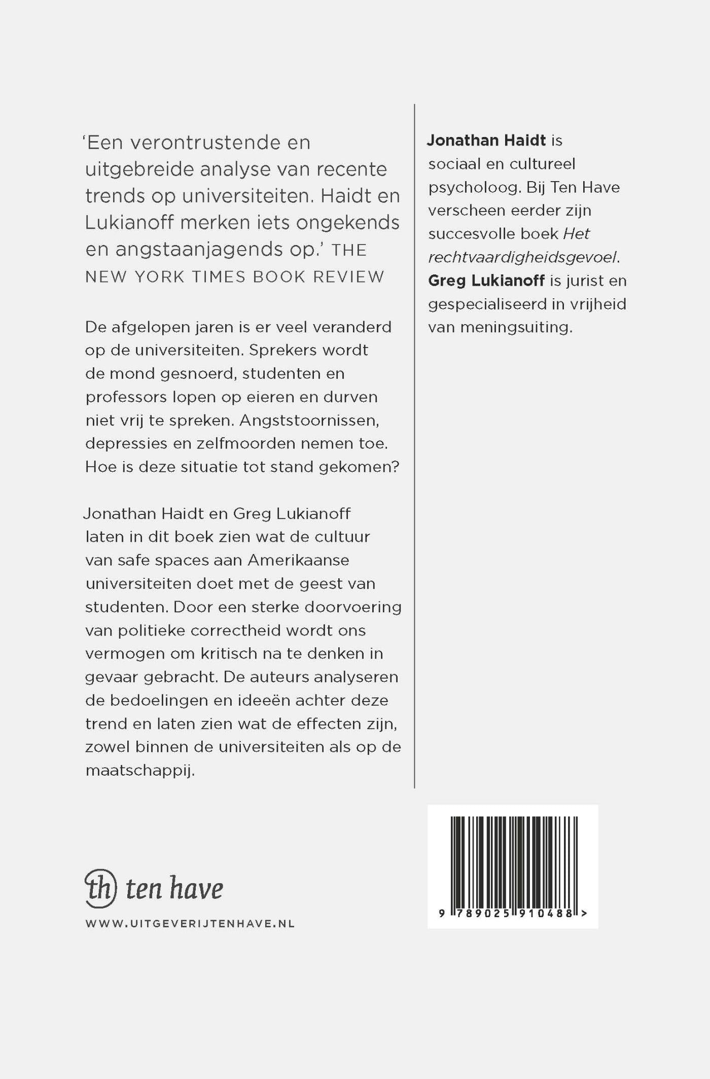 Jonathan Haidt en Greg Lukianoff laten in dit boek zien wat de cultuur van safe spaces aan Amerikaanse universiteiten doet met de geest van studenten. Door een sterke doorvoering van politieke correctheid wordt ons vermogen om kritisch na te denken in gevaar gebracht. De auteurs anlayseren de bedoelingen en ideeën achter deze trend en laten zien wat de effecten zijn, zowel binnen de universiteiten als op de maatschappij.